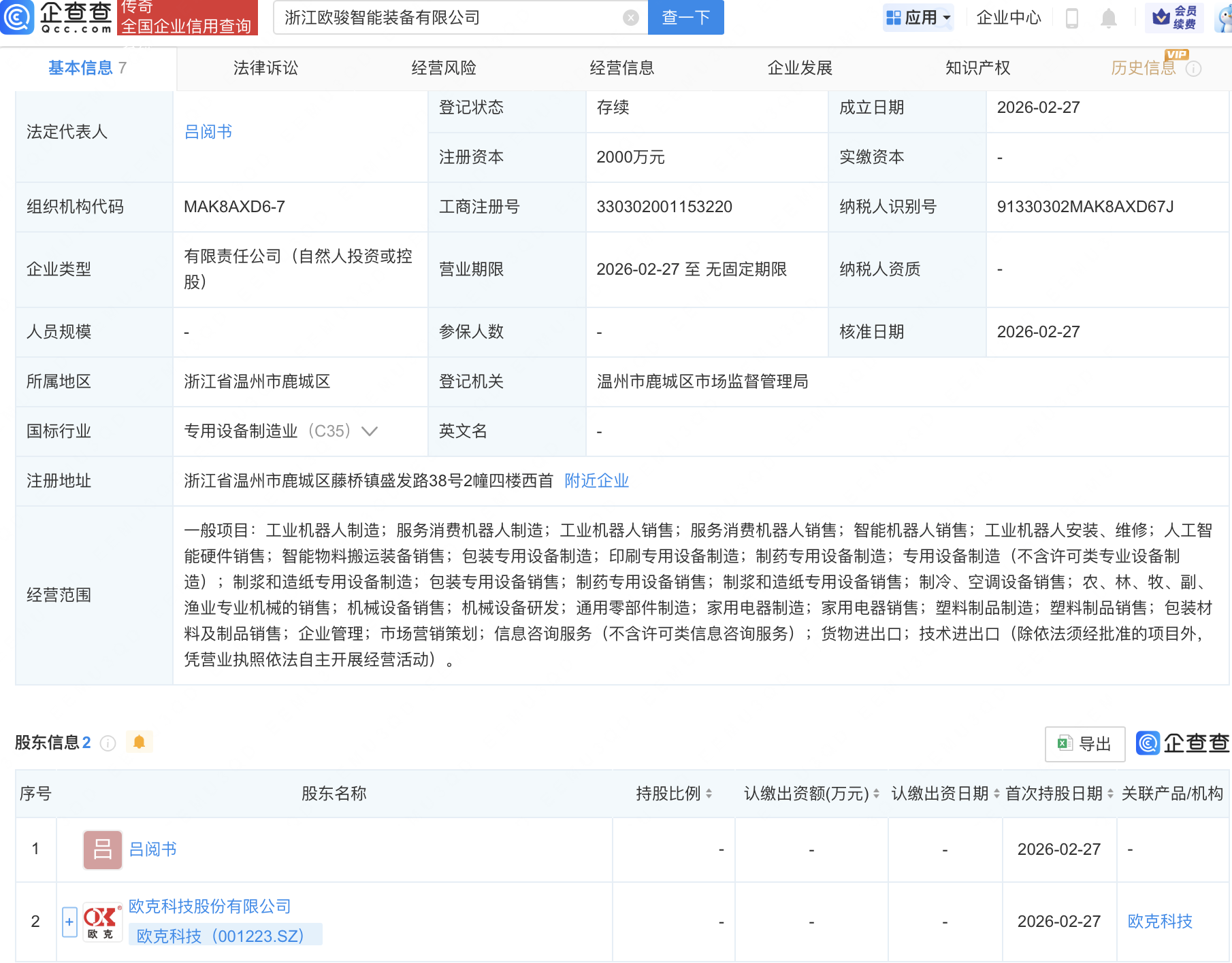 企查查APP显示,近日,浙江欧骏智能装备有限公司成立,注册资本2000万元,经营范围包含:工业机器人销售;服务消费机器人销售;智能机器人销售;工业机器人安装、维修;人工智能硬件销售等。企查查股权穿透显示,该公司由欧克科技(001223)等共同持股。