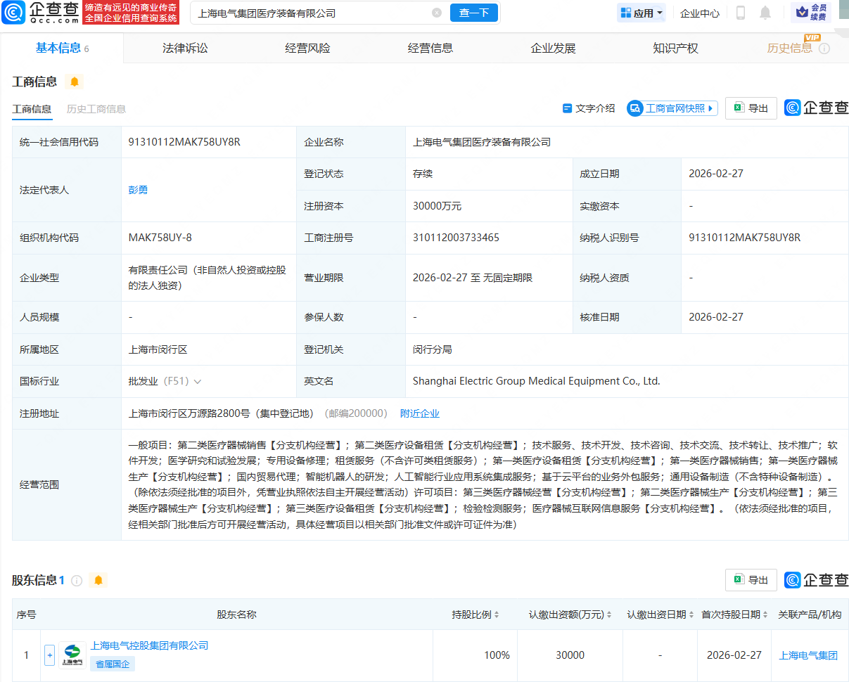 企查查APP显示,近日,上海电气集团医疗装备有限公司成立,法定代表人为彭勇,注册资本为3亿元,经营范围包含:第二类医疗器械销售;第二类医疗设备租赁;医学研究和试验发展;智能机器人的研发等。企查查股权穿透显示,该公司由上海电气控股集团有限公司全资持股。