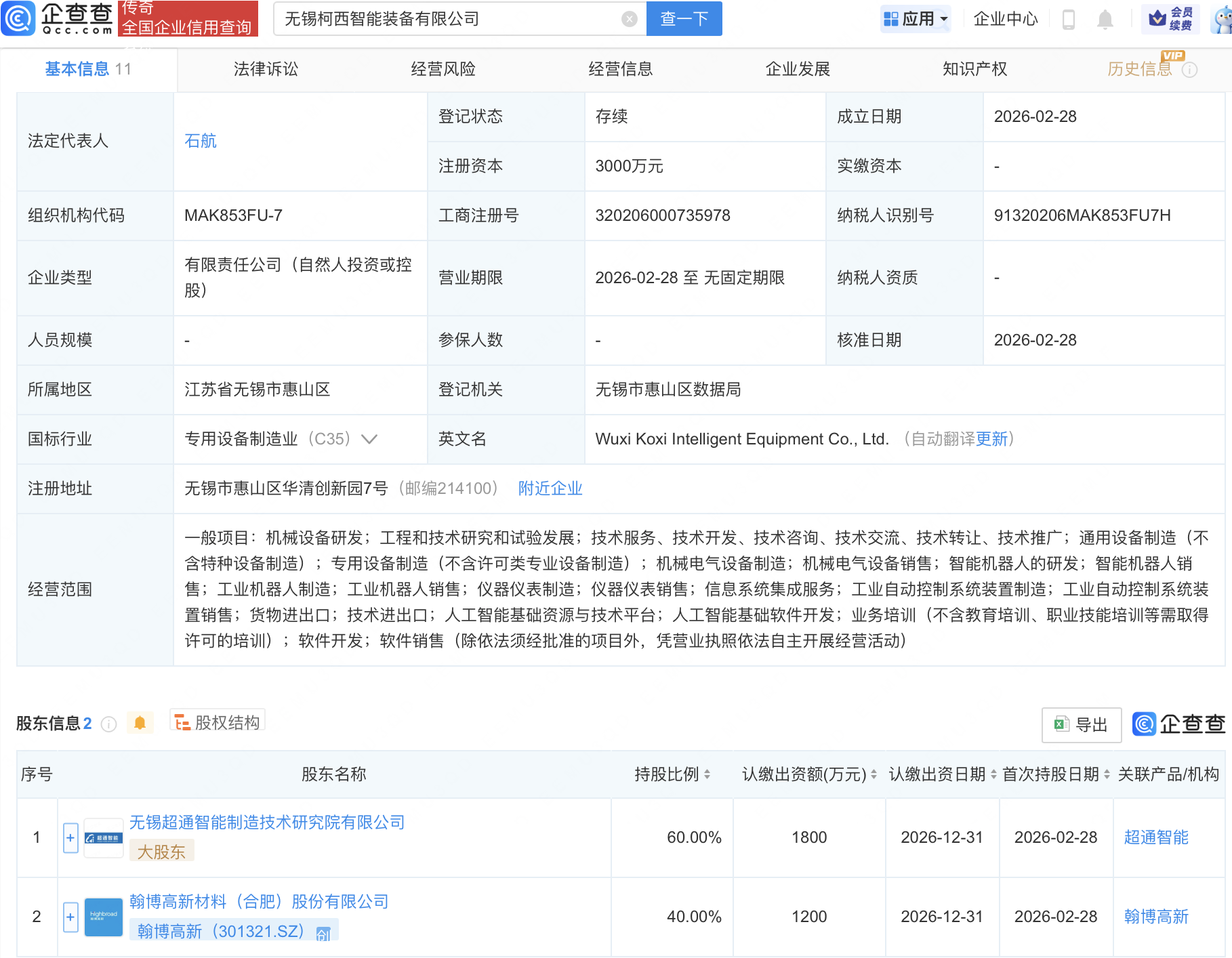 企查查APP显示,近日,无锡柯西智能装备有限公司成立,注册资本3000万元,经营范围包含:智能机器人的研发;智能机器人销售;工业机器人制造;人工智能基础资源与技术平台;人工智能基础软件开发等。企查查股权穿透显示,该公司由翰博高新(301321)等共同持股。