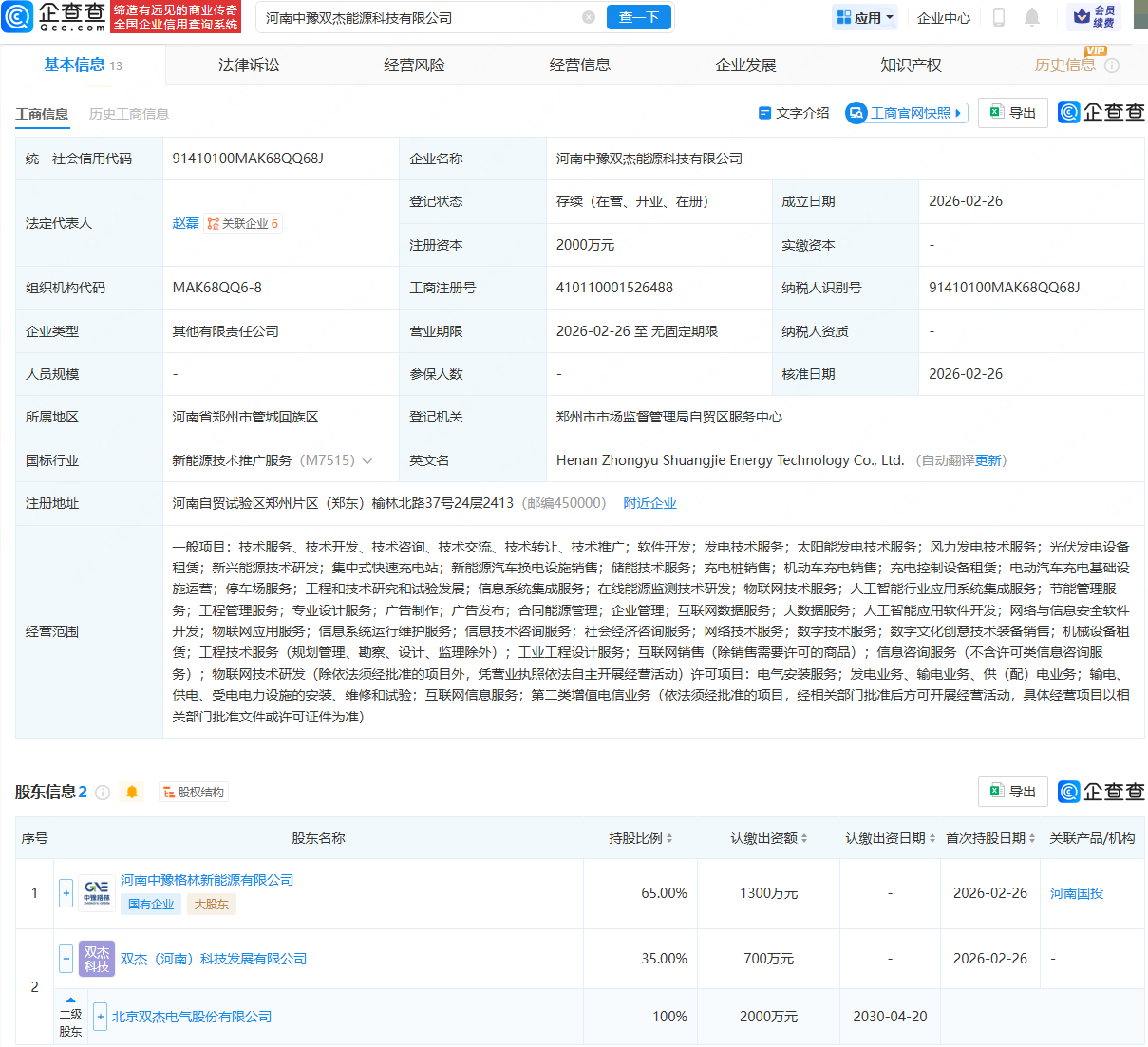 企查查APP显示,近日,河南中豫双杰能源科技有限公司成立,法定代表人为赵磊,注册资本为2000万元,经营范围包含:发电技术服务;太阳能发电技术服务;风力发电技术服务;光伏发电设备租赁;新兴能源技术研发等。企查查股权穿透显示,该公司由河南中豫格林新能源有限公司、双杰电气(300444)全资子公司双杰(河南)科技发展有限公司共同持股。