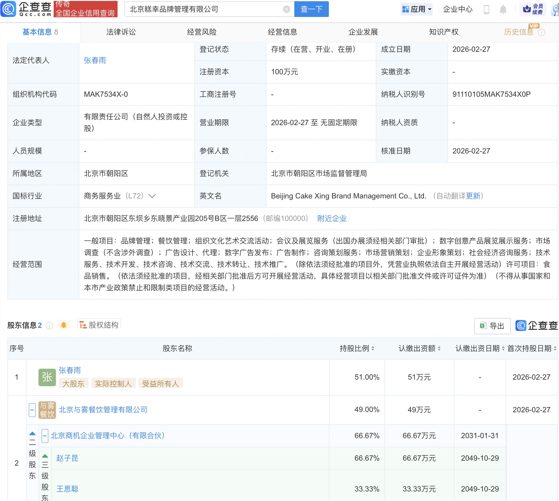 企查查APP显示,近日,北京糕幸品牌管理有限公司成立,法定代表人为张春雨,经营范围含品牌管理、餐饮管理、食品销售等。企查查股权穿透显示,该公司由张春雨、北京与雾餐饮管理有限公司共同持股,其中王思聪通过北京商机企业管理中心(有限合伙)间接持股北京与雾餐饮管理有限公司。