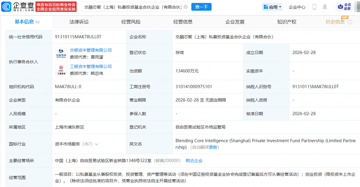 企查查APP显示,近日,交融芯智(上海)私募投资基金合伙企业(有限合伙)成立,出资额13.46亿元,经营范围包含:以私募基金从事股权投资、投资管理、资产管理等活动等。企查查股权穿透显示,该合伙企业由工银金融资产投资有限公司、交银金融资产投资有限公司、长电科技(600584)旗下上海云鲛龙企业管理有限公司等共同持股。