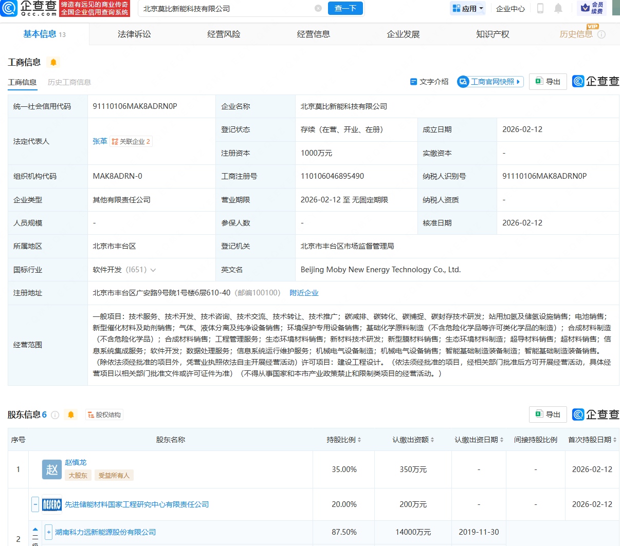 企查查APP显示,近日,北京莫比新能科技有限公司成立,法定代表人为张革,注册资本为1000万元,经营范围包含:站用加氢及储氢设施销售;电池销售;新型催化材料及助剂销售;生态环境材料销售;新材料技术研发等。企查查股权穿透显示,该公司由赵慎龙、科力远(600478)旗下先进储能材料国家工程研究中心有限责任公司等共同持股。