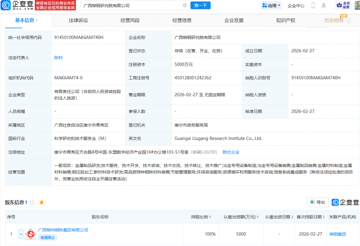 企查查APP显示,近日,广西柳钢研究院有限公司成立,法定代表人为陈利,注册资本为5000万元,经营范围包含:金属制品研发;冶金专用设备制造;金属制品销售;金属材料制造;新材料技术研发等。企查查股权穿透显示,该公司由广西柳州钢铁集团有限公司全资持股。