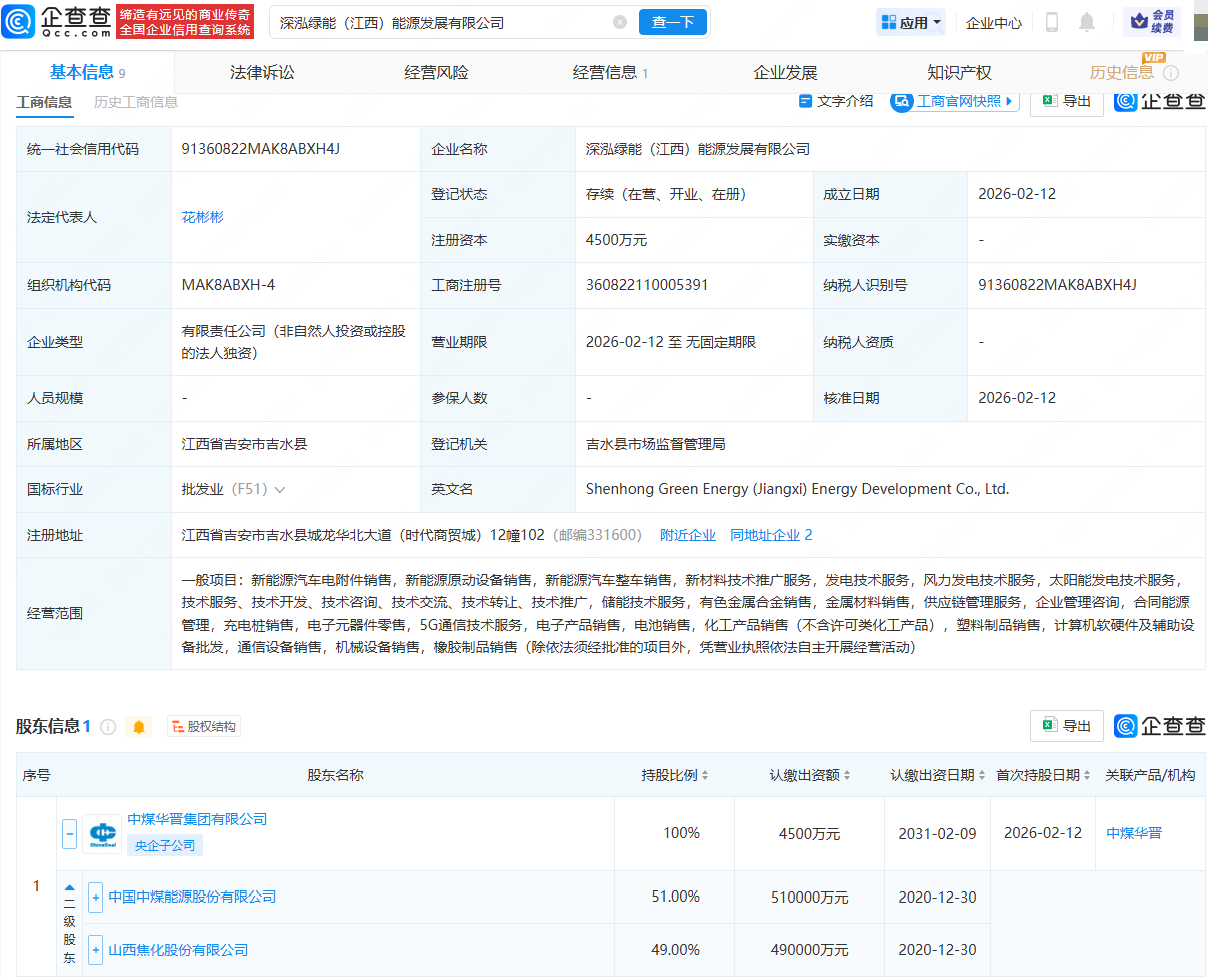 企查查APP显示,近日,深泓绿能(江西)能源发展有限公司成立,法定代表人为花彬彬,注册资本为4500万元,经营范围包含:新能源汽车电附件销售,新能源原动设备销售,新能源汽车整车销售,供应链管理服务等。企查查股权穿透显示,该公司由中煤华晋集团有限公司全资持股,后者由中煤能源(601898)、山西焦化(600740)共同持股。