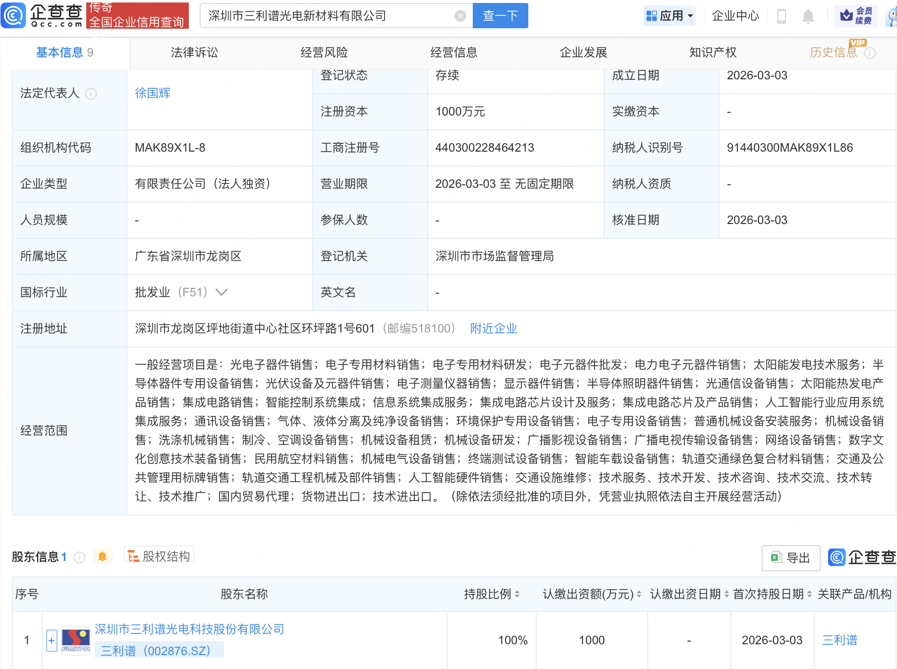 企查查APP显示,近日,深圳市三利谱光电新材料有限公司成立,注册资本1000万元,经营范围包含:集成电路芯片设计及服务;集成电路芯片及产品销售;人工智能行业应用系统集成服务;人工智能硬件销售等。企查查股权穿透显示,该公司由三利谱(002876)全资持股。
