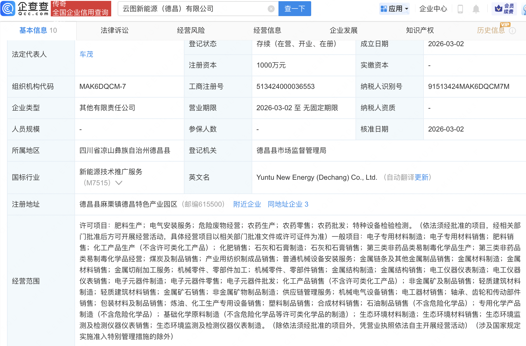 企查查APP显示,近日,云图新能源(德昌)有限公司、云图新能源(遂宁)有限公司成立,注册资本均为1000万元,经营范围均包含:生态环境材料制造;生态环境材料销售;生态环境监测及检测仪器仪表销售;生态环境监测及检测仪器仪表制造等。企查查股权穿透显示,二者皆由云图控股(002539)间接全资持股。