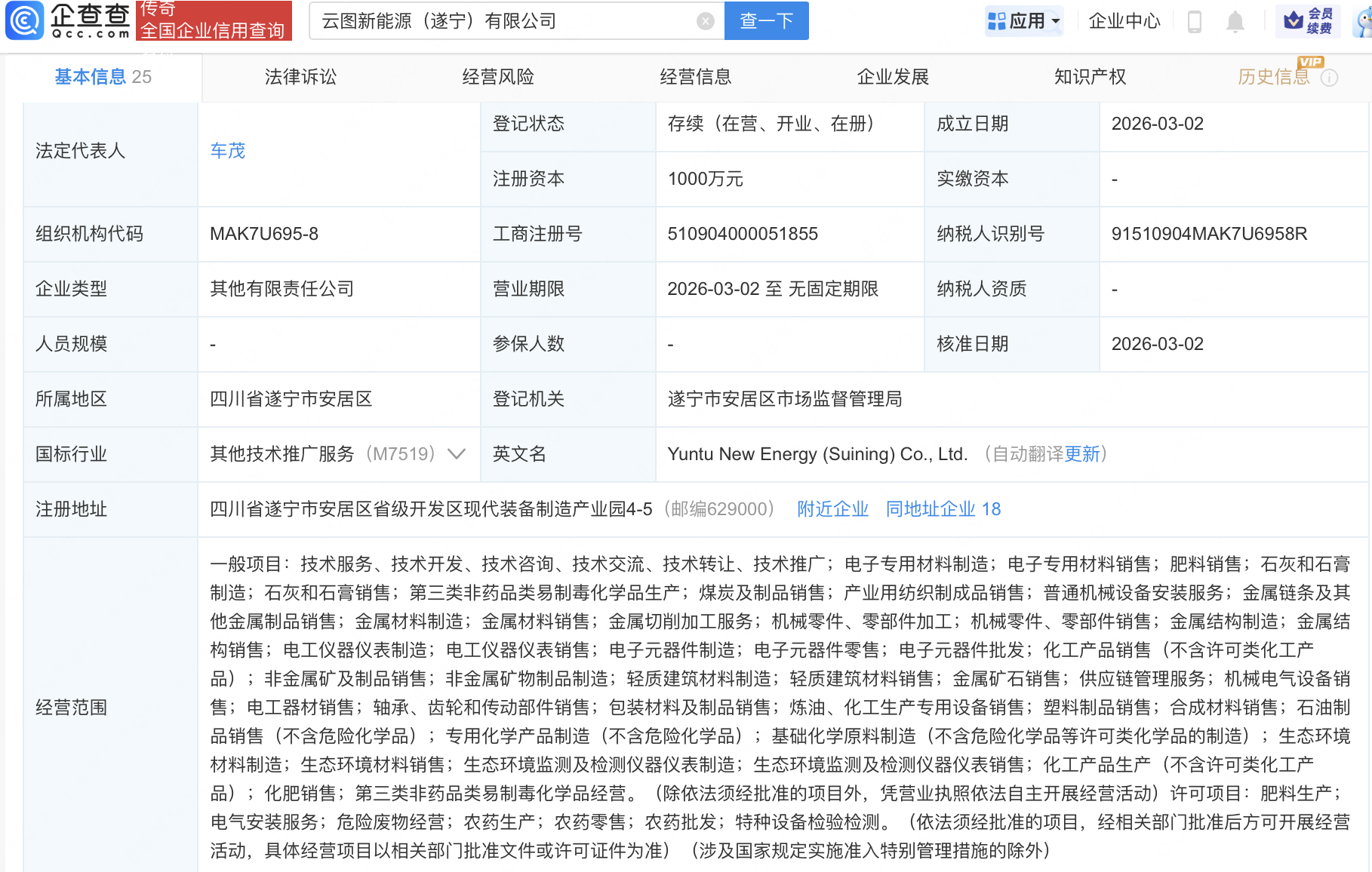 企查查APP显示,近日,云图新能源(德昌)有限公司、云图新能源(遂宁)有限公司成立,注册资本均为1000万元,经营范围均包含:生态环境材料制造;生态环境材料销售;生态环境监测及检测仪器仪表销售;生态环境监测及检测仪器仪表制造等。企查查股权穿透显示,二者皆由云图控股(002539)间接全资持股。