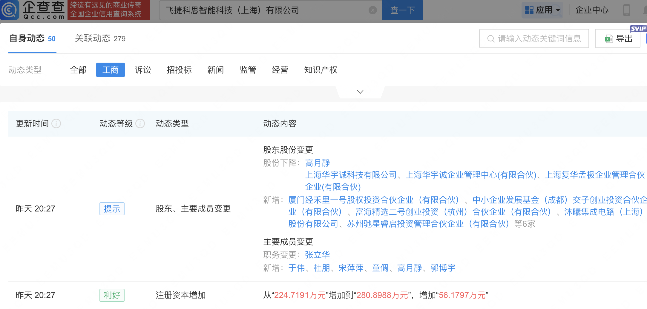 企查查APP显示,近日,飞捷科思智能科技(上海)有限公司发生工商变更,新增沐曦股份(688802)等为股东,同时注册资本增至280.9万元。企查查信息显示,该公司成立于2024年,经营范围包含:人工智能行业应用系统集成服务;人工智能应用软件开发;集成电路芯片及产品销售;智能机器人销售等。公开信息显示,飞捷科思是一家物理AI基础设施供应商,专注于人工智能与异构计算、具身智能与机器人、元宇宙与数字孪生等前沿科技领域。
