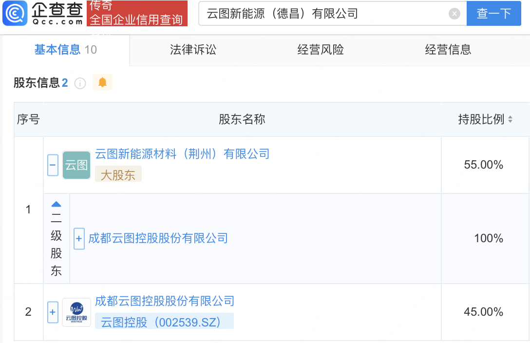 企查查APP显示,近日,云图新能源(德昌)有限公司、云图新能源(遂宁)有限公司成立,注册资本均为1000万元,经营范围均包含:生态环境材料制造;生态环境材料销售;生态环境监测及检测仪器仪表销售;生态环境监测及检测仪器仪表制造等。企查查股权穿透显示,二者皆由云图控股(002539)间接全资持股。