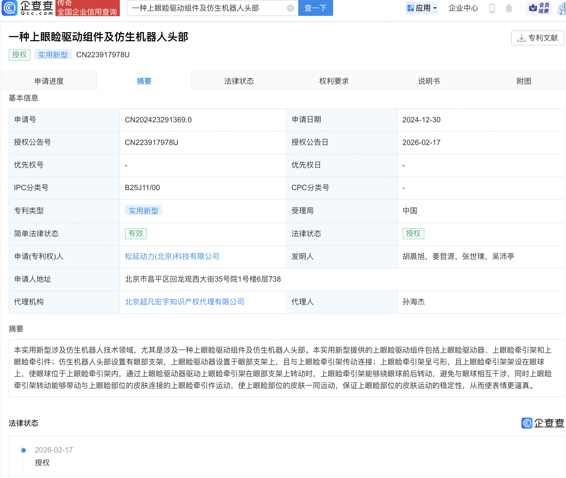 企查查APP显示,近日,松延动力(北京)科技有限公司“一种上眼睑驱动组件及仿生机器人头部”专利获授权。企查查专利摘要显示,本实用新型涉及仿生机器人技术领域,本实用新型提供的上眼睑驱动组件包括上眼睑驱动器、上眼睑牵引架和上眼睑牵引件;仿生机器人头部设置有眼部支架,上眼睑驱动器设置于眼部支架上,且与上眼睑牵引架传动连接;上眼睑牵引架呈弓形,且上眼睑牵引架架设在眼球上,使眼球位于上眼睑牵引架内,通过上眼睑驱动器驱动上眼睑牵引架在眼部支架上转动时,上眼睑牵引架能够绕眼球前后转动,避免与眼球相互干涉,同时上眼睑牵引架转动能够带动与上眼睑部位的皮肤连接的上眼睑牵引件运动,使上眼睑部位的皮肤一同运动,保证上眼睑部位的皮肤运动的稳定性,从而使表情更逼真。