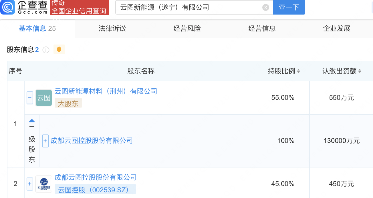 企查查APP显示,近日,云图新能源(德昌)有限公司、云图新能源(遂宁)有限公司成立,注册资本均为1000万元,经营范围均包含:生态环境材料制造;生态环境材料销售;生态环境监测及检测仪器仪表销售;生态环境监测及检测仪器仪表制造等。企查查股权穿透显示,二者皆由云图控股(002539)间接全资持股。