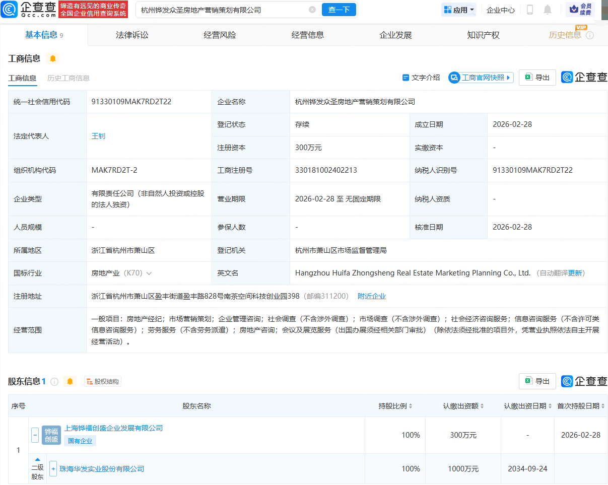 企查查APP显示,近日,杭州铧发众圣房地产营销策划有限公司成立,法定代表人为王钊,经营范围包含:房地产经纪;市场营销策划;企业管理咨询;社会调查(不含涉外调查);市场调查(不含涉外调查)等。企查查股权穿透显示,该公司由华发股份(600325)间接全资持股。