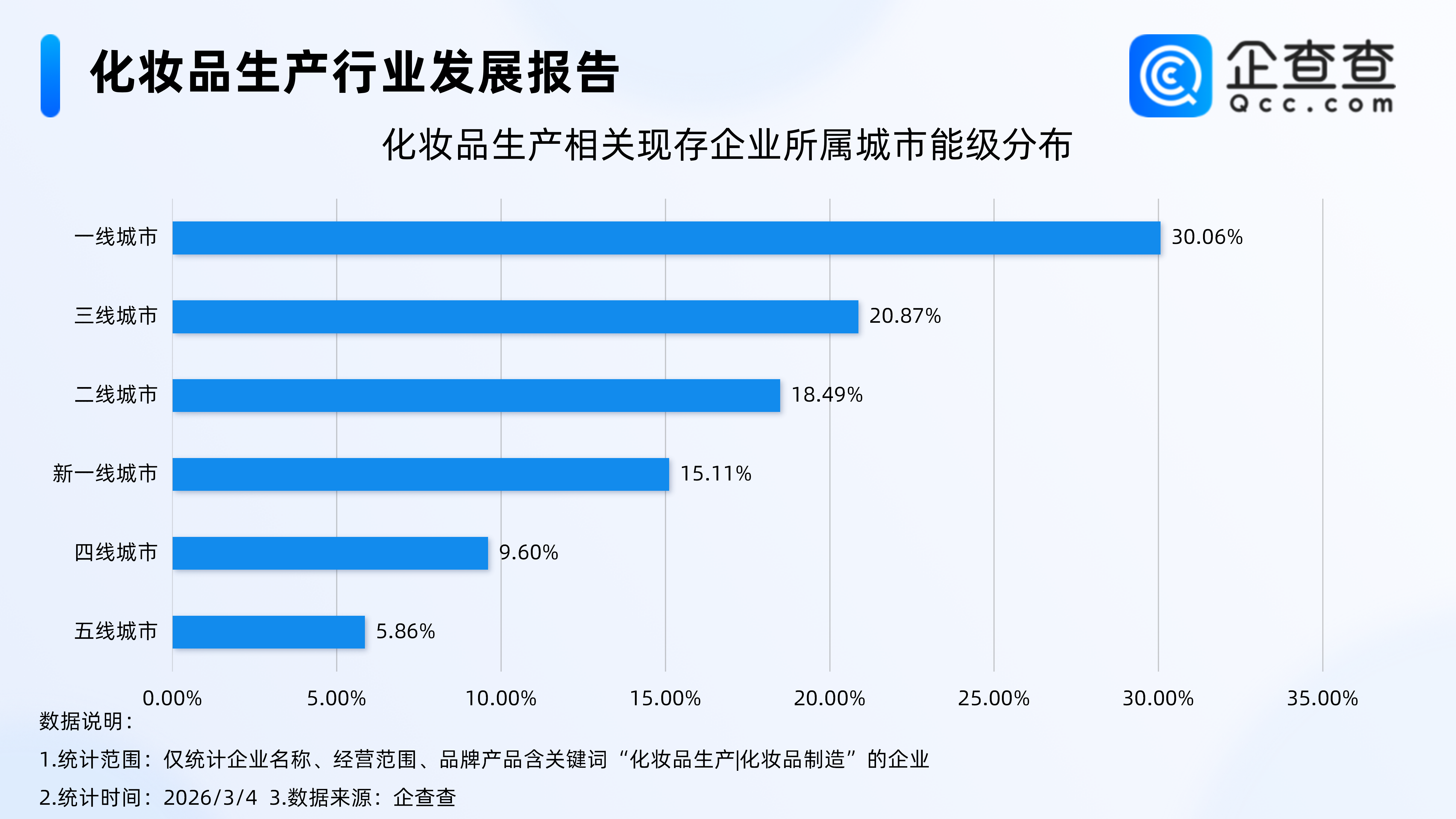 企查查数据显示,截至3月4日,国内化妆品生产相关现存企业达7.93万家,从化妆品生产相关企业的城市能级分布来看,一线城市成为行业集聚核心区域,占比高达 30.06%,其次为三线、二线城市,分别占比20.87%、18.49%。分布在新一线城市的化妆品生产相关企业,占比15.11%。