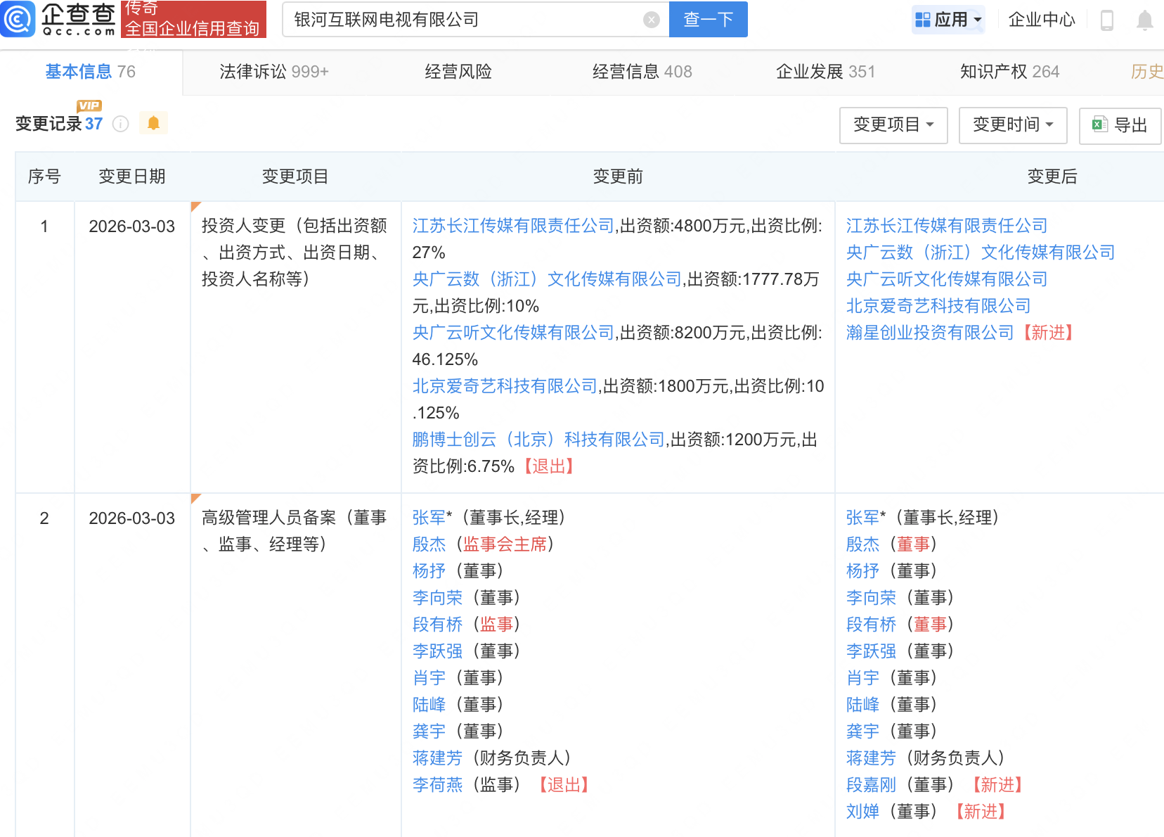 企查查APP显示,近日,银河互联网电视有限公司发生工商变更,鹏博士创云(北京)科技有限公司退出股东行列,新增小米关联公司瀚星创业投资有限公司为股东。企查查信息显示,该公司成立于2012年,经营范围包含:广播电视节目制作经营;第一类增值电信业务;第二类增值电信业务;网络文化经营等。公开信息显示,银河互联网电视由中央广播电视总台、北京爱奇艺科技有限公司等共同发起,公司持有互联网电视集成服务和内容服务双牌照。