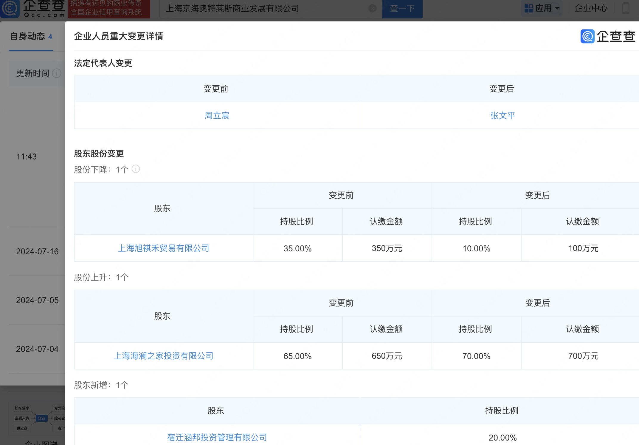 企查查APP显示,近日,上海京海奥特莱斯商业发展有限公司发生工商变更,新增京东旗下宿迁涵邦投资管理有限公司为股东,法定代表人从海澜集团董事长周立宸变更为张文平。