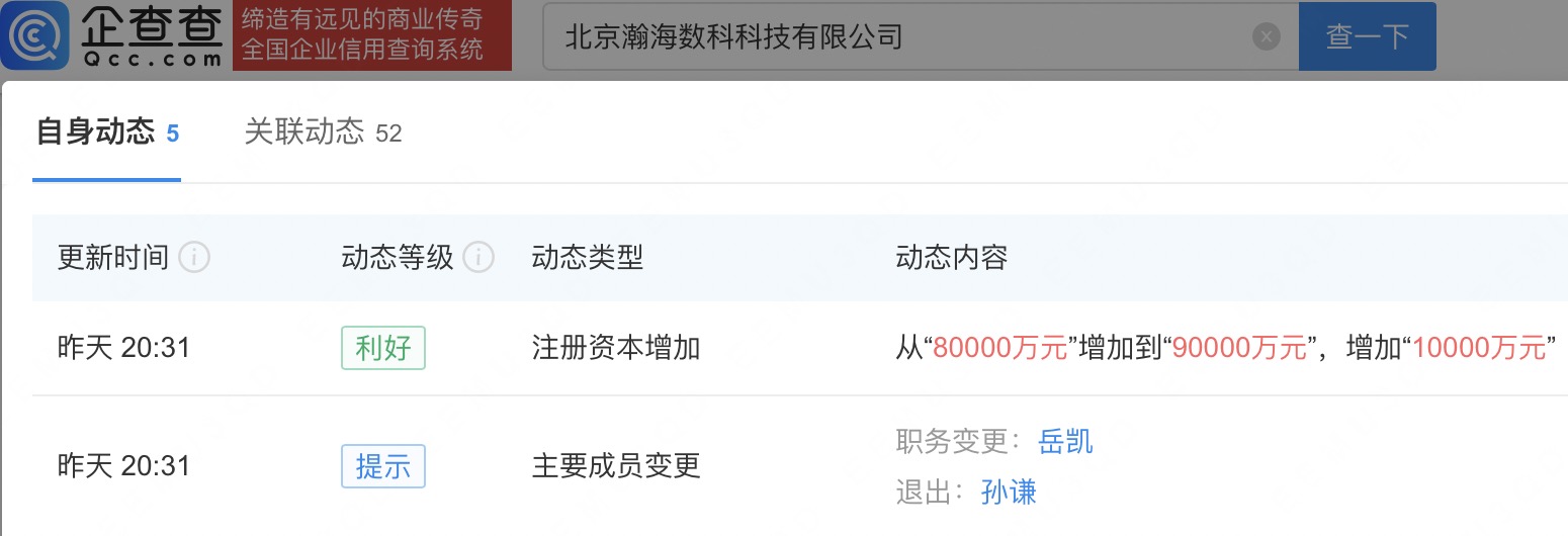 企查查APP显示,近日,北京瀚海数科科技有限公司发生工商变更,注册资本由8亿人民币增至9亿人民币。 企查查信息显示,该公司成立于2023年,法定代表人为岳凯,经营范围包括信息咨询服务、计算机软硬件及辅助设备零售、广告发布等,由小米金融(香港)有限公司全资持股。