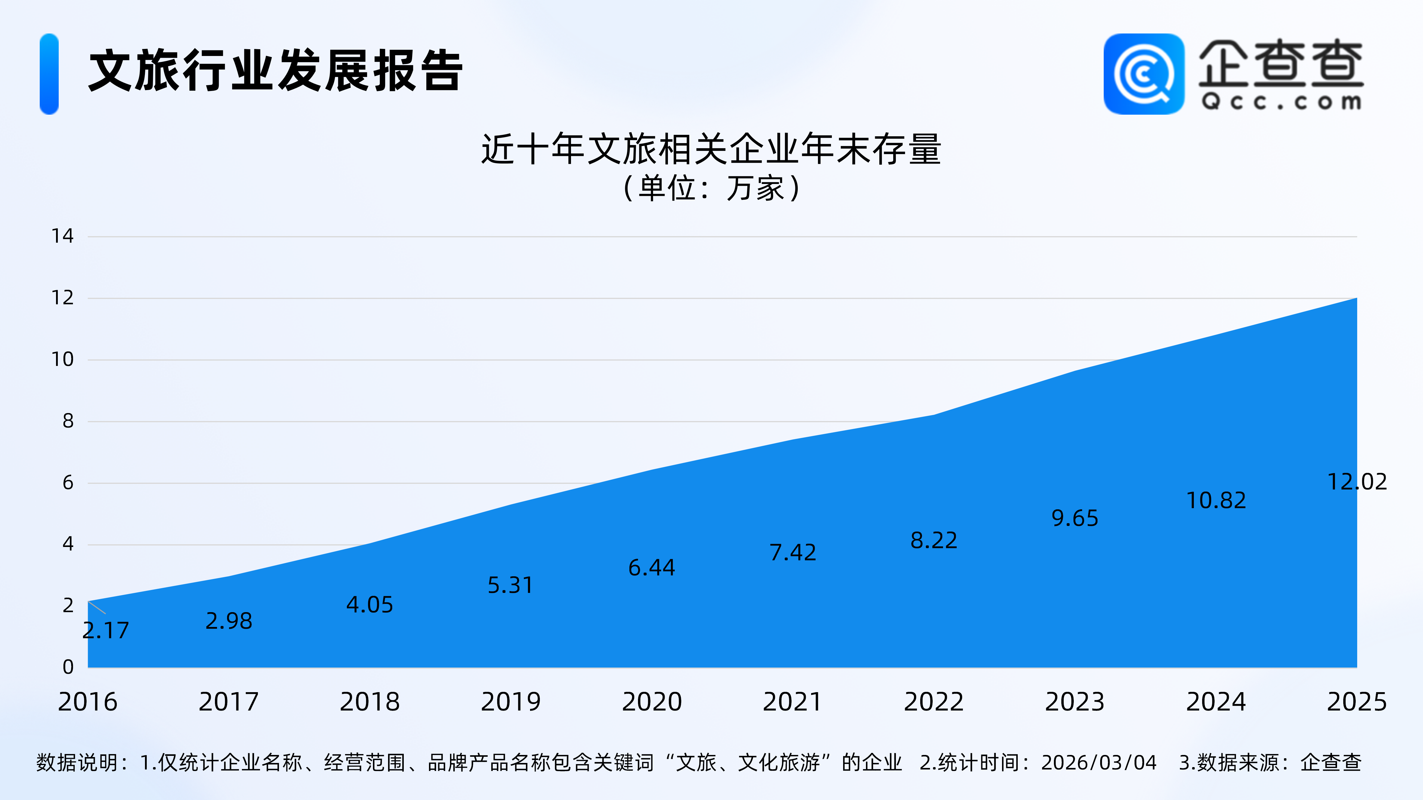 企查查数据显示,截至3月4日,国内现存文旅相关企业12.64万家。近十年文旅相关企业的发展呈现出稳步扩张的态势,存量规模连年攀升。2016 年国内文旅相关企业存量仅 2.17 万家,到 2025 年末已增至 12.02 万家,十年间增长近5倍。注册量方面,2025年全年注册2.06万家文旅相关企业。截至3月4日,今年已注册0.25万家文旅相关企业。