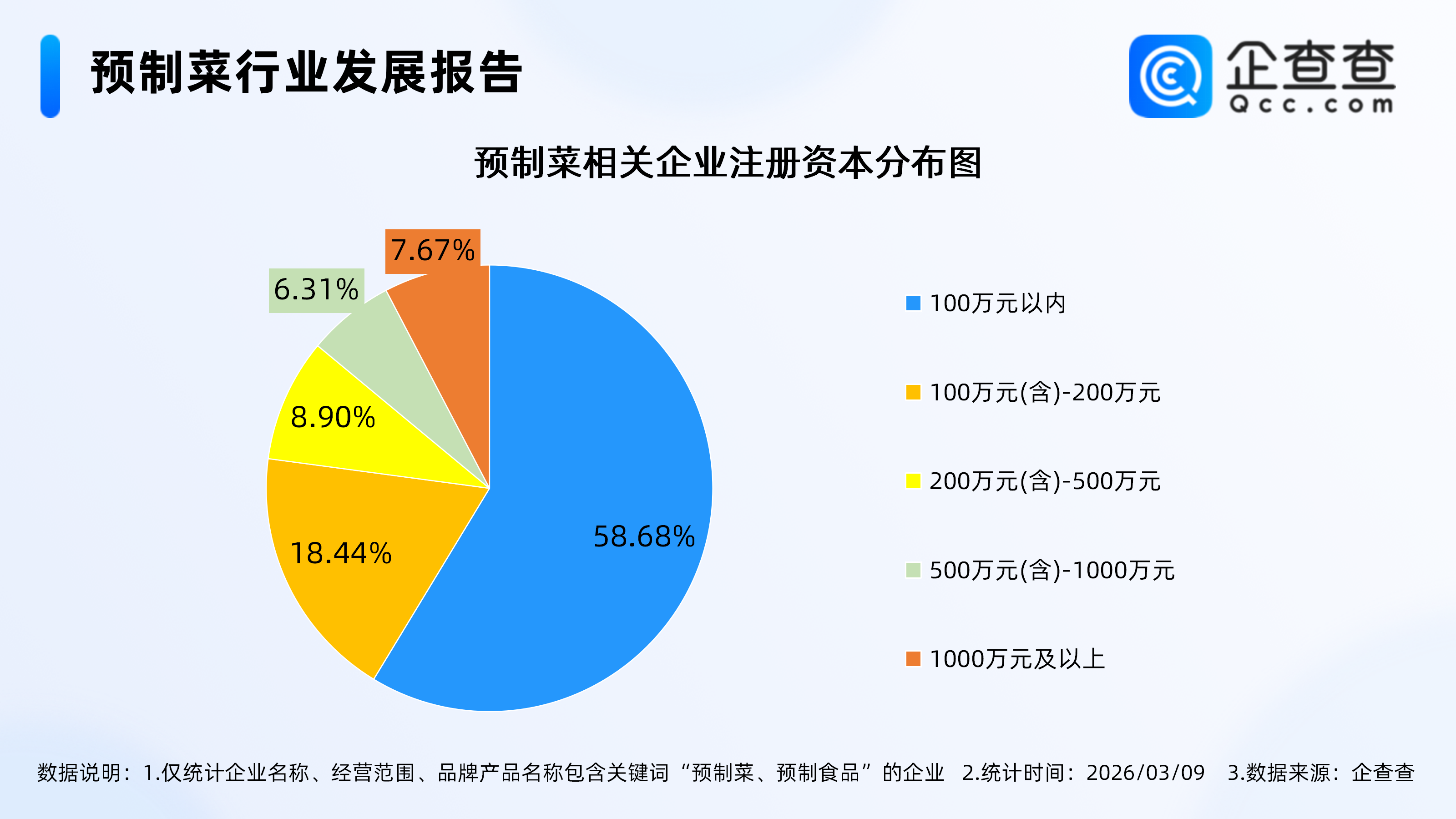 企查查数据显示,截至3月9日,国内现存预制菜相关企业3.07万家。近十年相关企业注册量呈整体快速增长态势,2025年全年注册量同比增长20.67%至1.3万余家。截至目前,今年已注册预制菜相关企业1150家。存量方面,从注册资本分布来看,现存预制菜相关企业多为轻量级企业,注册资本在100万元以内的相关企业占比58.68%。从地区分布来看,现存预制菜相关企业主要分布在华东地区,占比达39.30%。