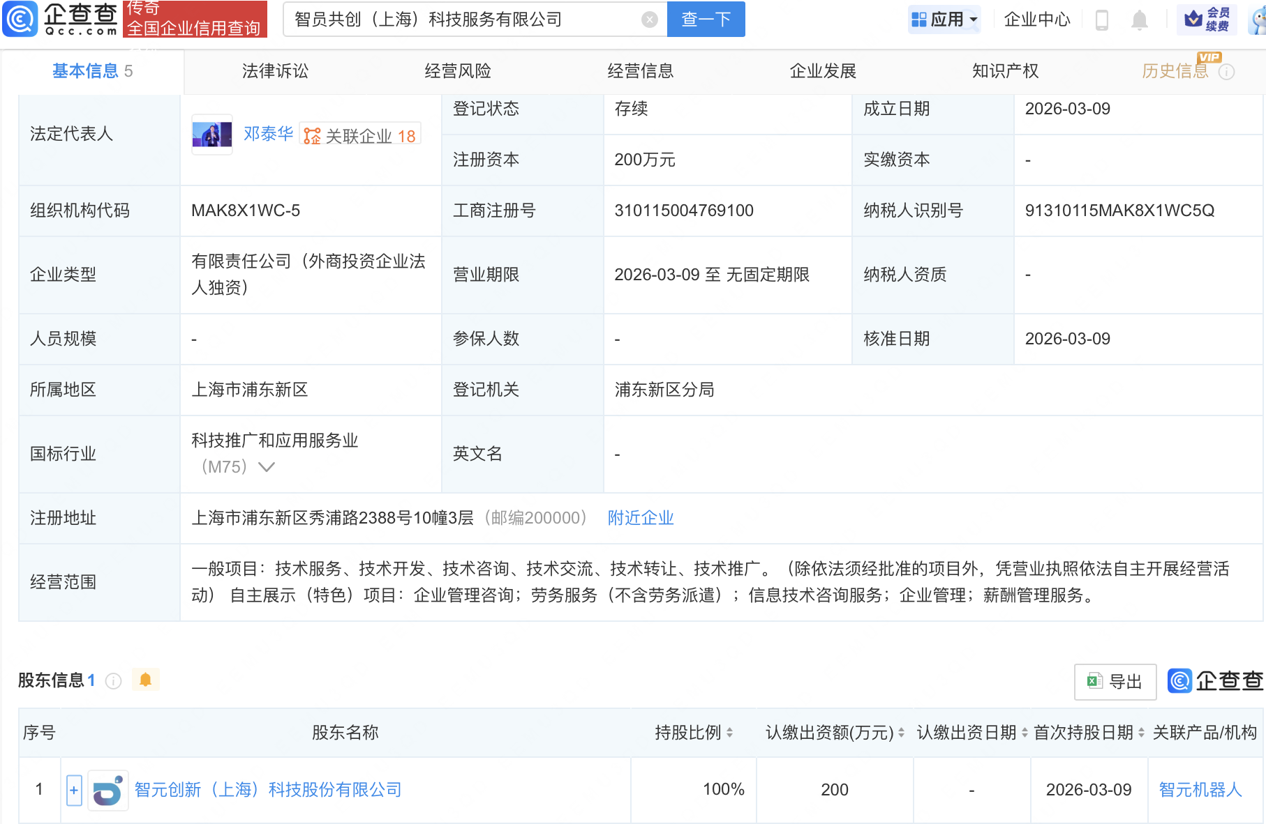 企查查APP显示,近日,智员共创(上海)科技服务有限公司成立,经营范围包含:企业管理咨询;劳务服务(不含劳务派遣);信息技术咨询服务;企业管理等。企查查股权穿透显示,该公司由智元机器人关联公司智元创新(上海)科技股份有限公司全资持股。
