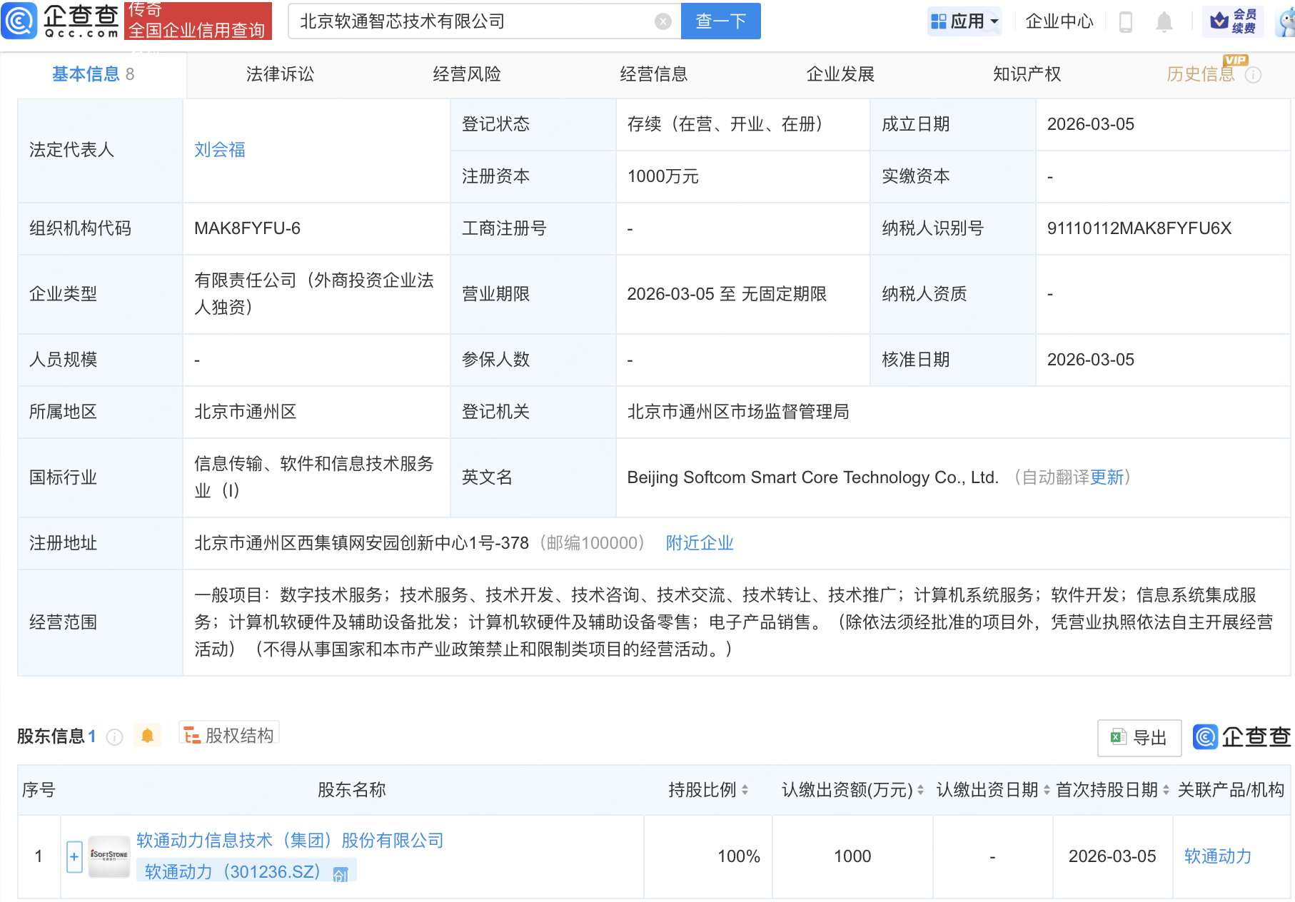 企查查APP显示,近日,北京软通智芯技术有限公司成立,注册资本1000万元,经营范围包含:数字技术服务;计算机系统服务;软件开发;信息系统集成服务等。企查查股权穿透显示,该公司由软通动力(301236)全资持股。