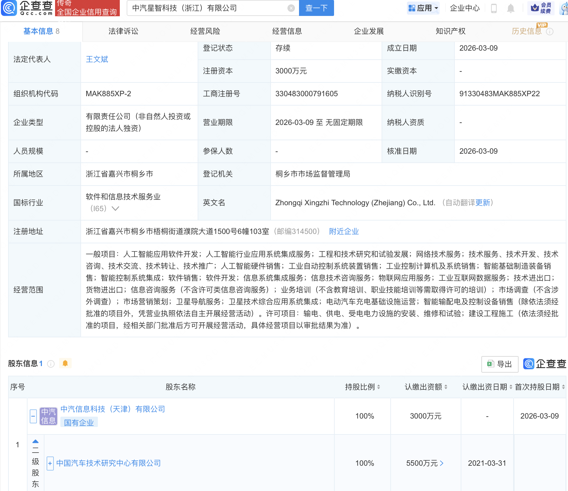 企查查APP显示,近日,中汽星智科技(浙江)有限公司成立,注册资本3000万元,经营范围包含:人工智能应用软件开发;人工智能行业应用系统集成服务;卫星导航服务;卫星技术综合应用系统集成等。企查查股权穿透显示,该公司由中国汽车技术研究中心有限公司间接全资持股。