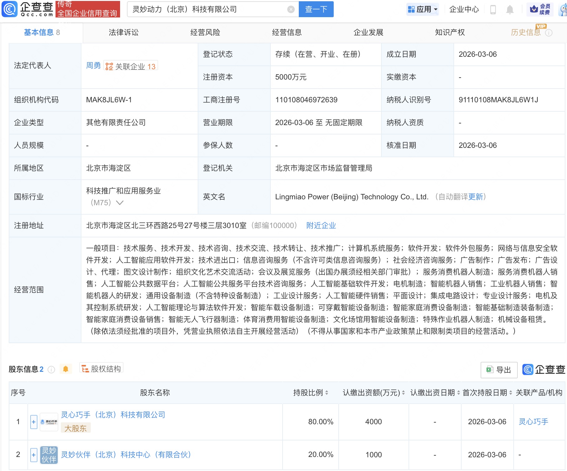 企查查APP显示,近日,灵妙动力(北京)科技有限公司成立,经营范围包含:智能机器人的研发;人工智能理论与算法软件开发;智能家庭消费设备销售;智能无人飞行器制造等。企查查股权穿透显示,该公司由灵心巧手(北京)科技有限公司等共同持股。