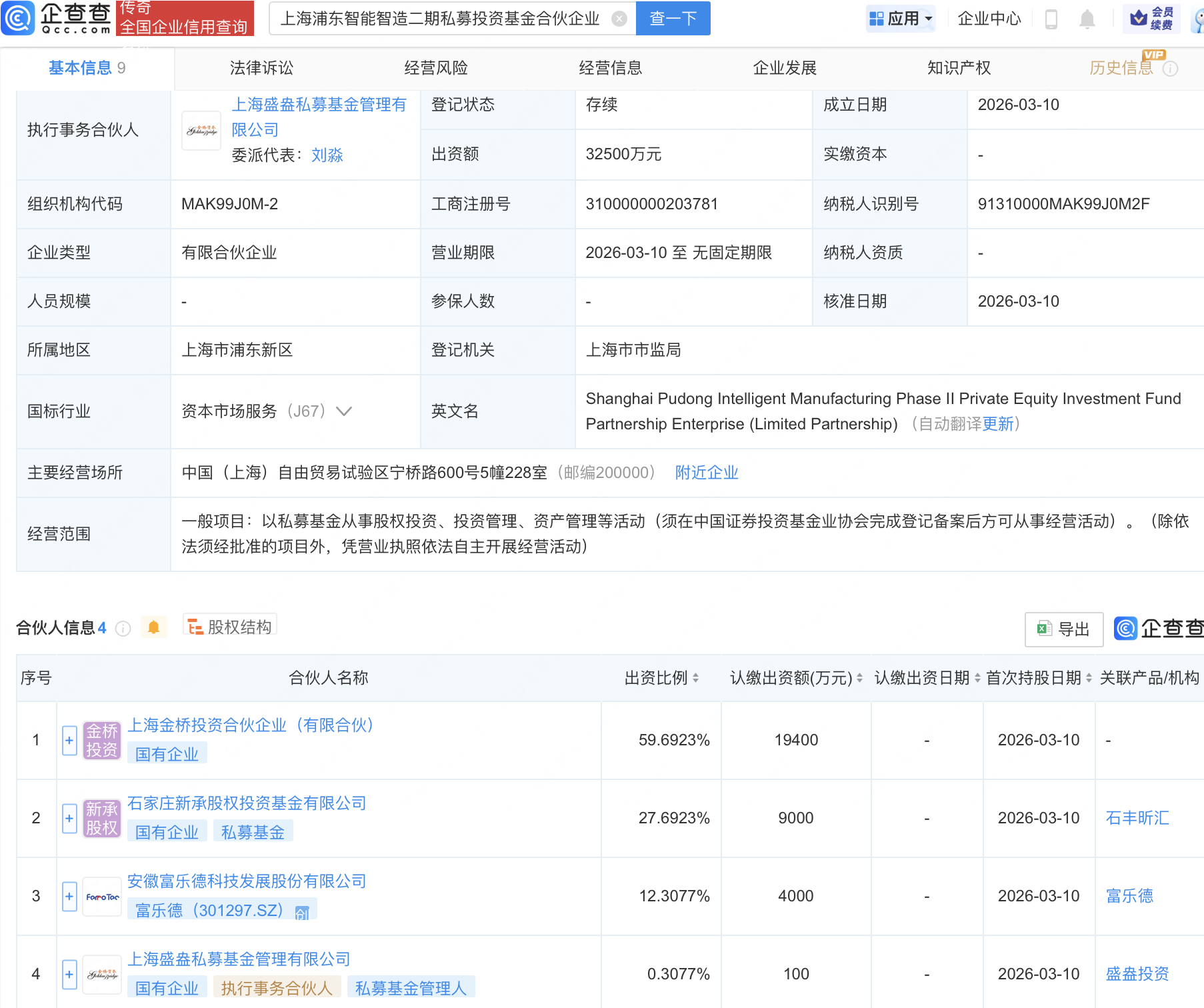 企查查APP显示,近日,上海浦东智能智造二期私募投资基金合伙企业(有限合伙)成立,出资额3.25亿元,经营范围包含:以私募基金从事股权投资、投资管理、资产管理等活动。企查查股权穿透显示,该企业由富乐德(301297)等共同出资。