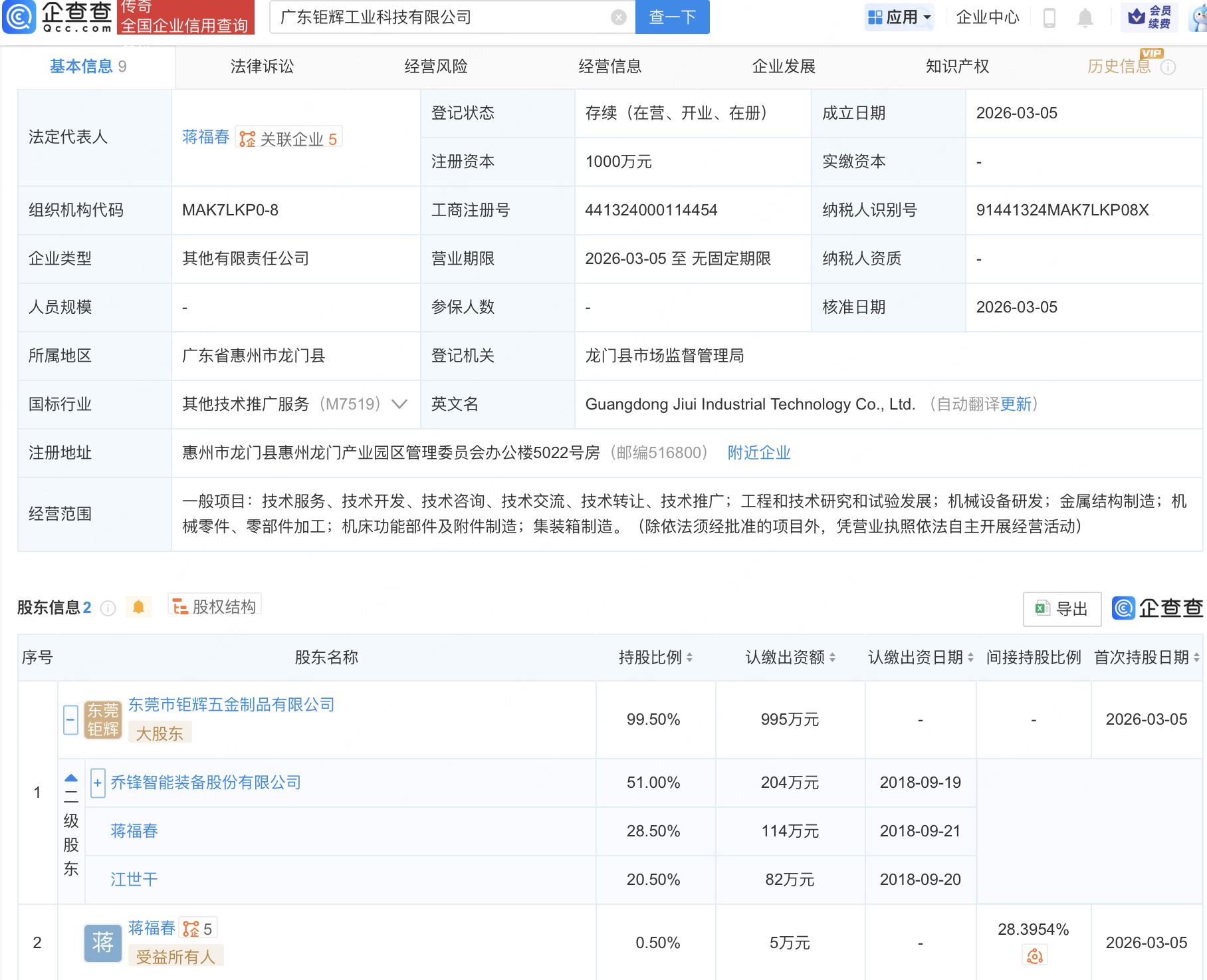 企查查APP显示,近日,广东钜辉工业科技有限公司成立,注册资本1000万元,经营范围包含:工程和技术研究和试验发展;机械设备研发;金属结构制造;机械零件、零部件加工;机床功能部件及附件制造等。企查查股权穿透显示,该公司由乔锋智能(301603)旗下东莞市钜辉五金制品有限公司等共同持股。