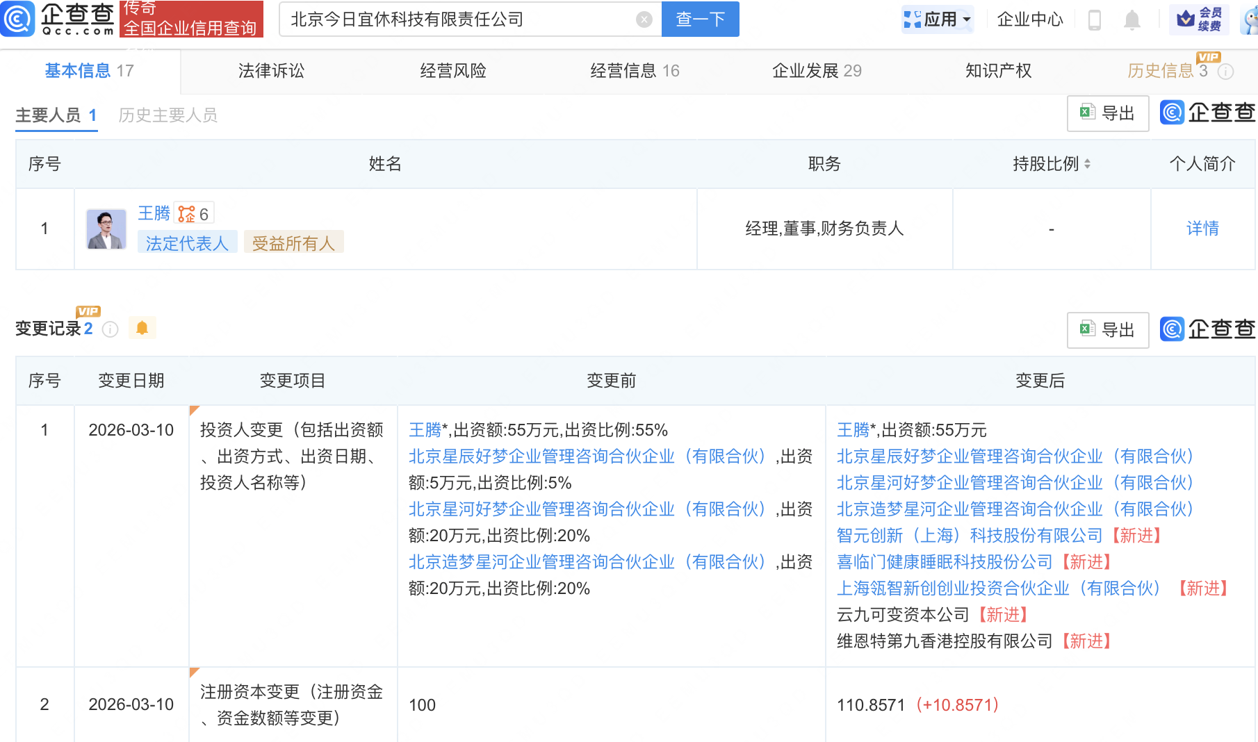 企查查APP显示,近日,北京今日宜休科技有限责任公司发生工商变更,新增智元机器人关联公司智元创新(上海)科技股份有限公司、喜临门(603008)等为股东,同时注册资本增至110.86万元。企查查信息显示,该公司成立于2026年1月,法定代表人为小米前高管王腾,经营范围含集成电路销售、人工智能应用软件开发、人工智能基础软件开发等。