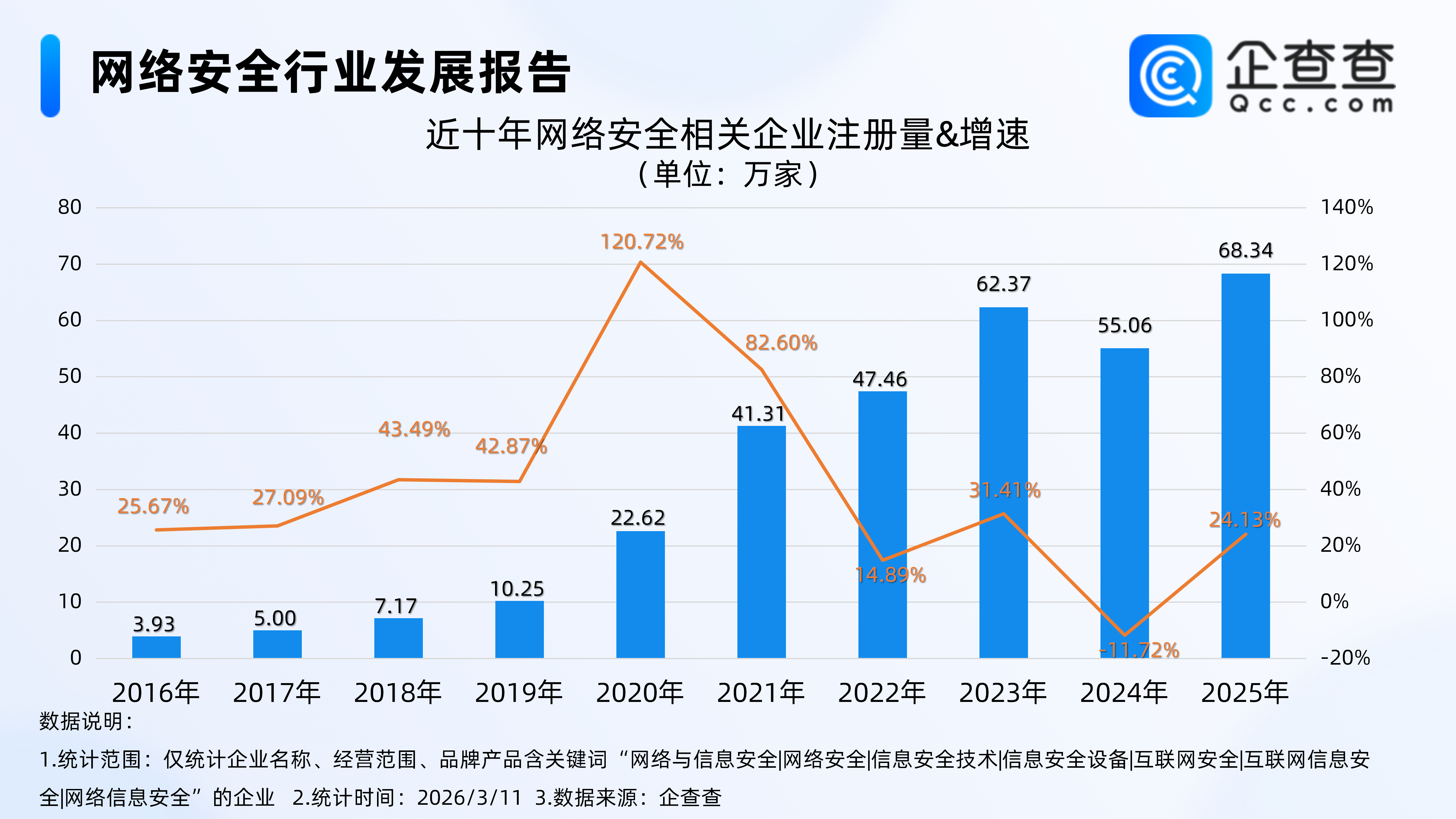 企查查数据显示,从注册数据来看,2016年至2025年,网络安全相关企业注册量从最初的数万家规模一路攀升,2025年注册量更是达到68.34万家,同比增长24.13%,创下近十年年度注册量新纪录。在此过程中,行业虽在个别年份出现增速小幅波动,但整体增长态势未变,2020年企业注册增速甚至达到120.72%的高点,反映出市场对网络安全领域的关注度和布局意愿持续提升。