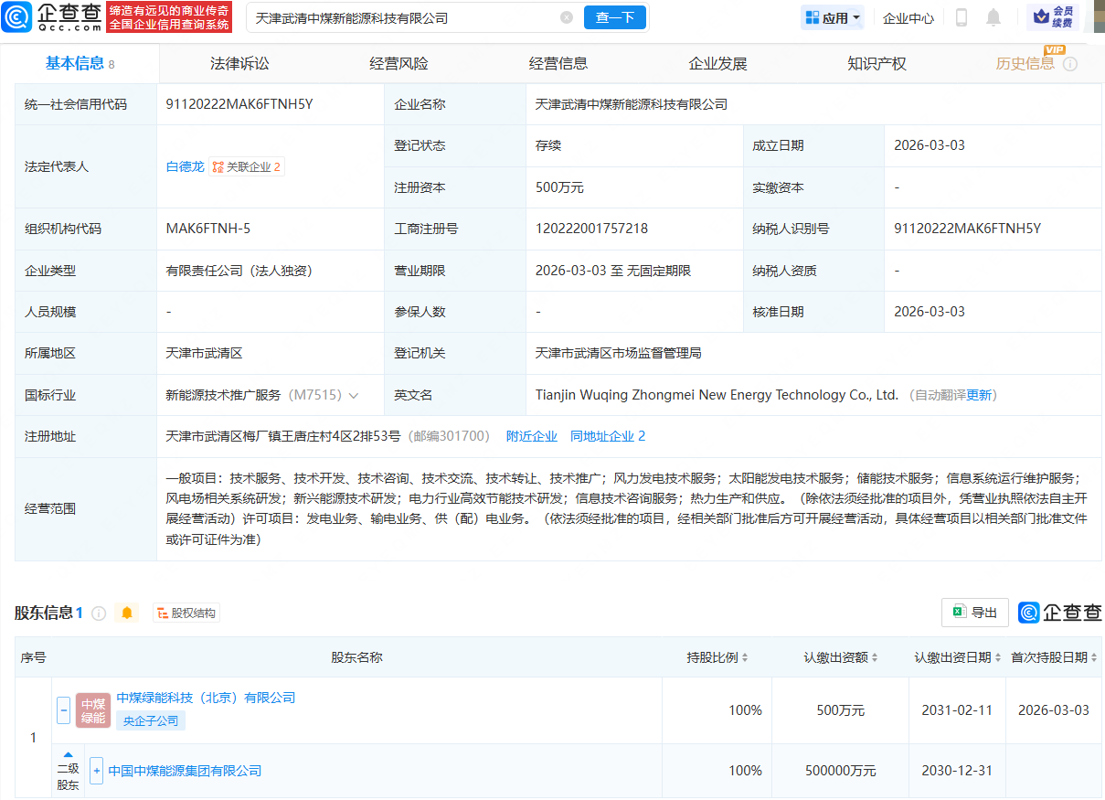 企查查APP显示,近日,天津武清中煤新能源科技有限公司成立,法定代表人为白德龙,经营范围包含:风力发电技术服务;太阳能发电技术服务;储能技术服务;风电场相关系统研发;热力生产和供应等。企查查股权穿透显示,该公司由中国中煤能源集团有限公司间接全资持股。