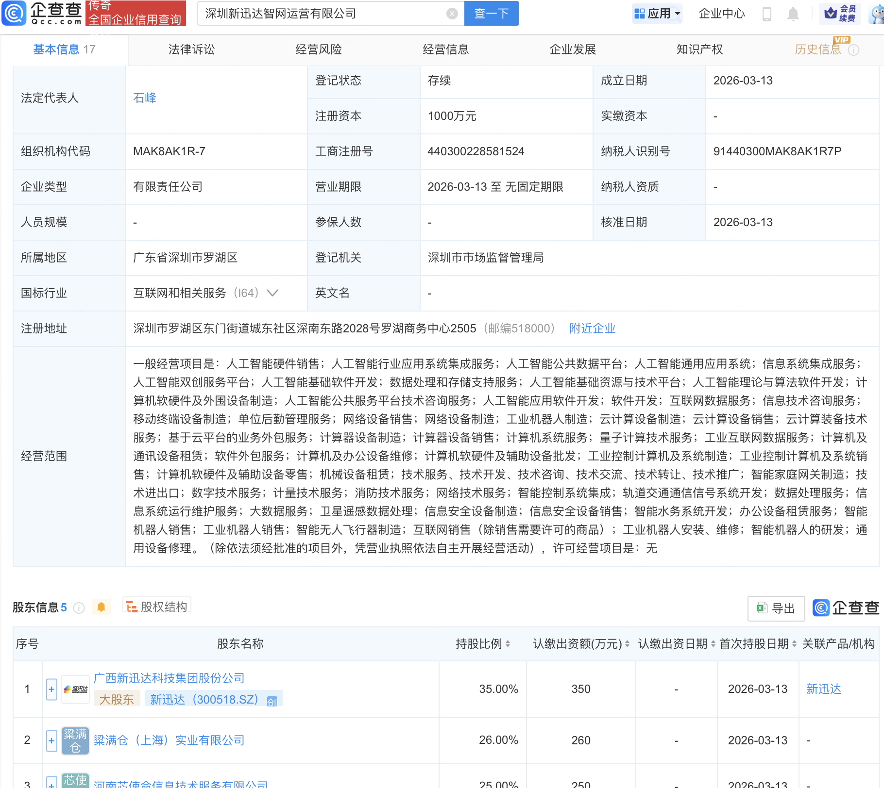 企查查APP显示,近日,深圳新迅达创算科技有限公司、深圳新迅达智网运营有限公司成立,经营范围均包含:人工智能公共数据平台;人工智能通用应用系统;智能机器人的研发等。企查查股权穿透显示,二者皆由新迅达(300518)等共同持股。
