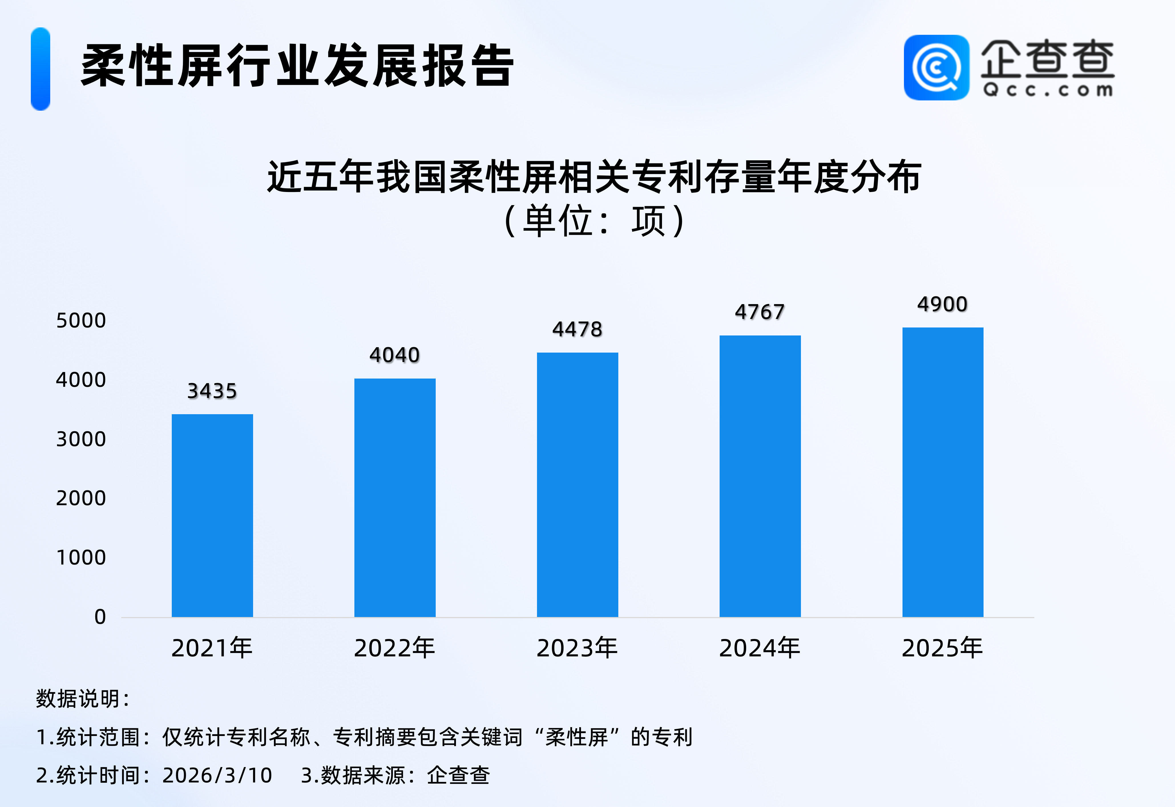 企查查数据显示,我国柔性屏相关专利储备持续增长,2025年年末相关专利数量已达4900项,截至2026年3月10日,国内柔性屏相关专利数量进一步增至4905项。近五年我国柔性屏相关专利存量实现逐年稳定增长,2021至2025年的专利存量依次为3435项、4040项、4478项、4767项、4900项。