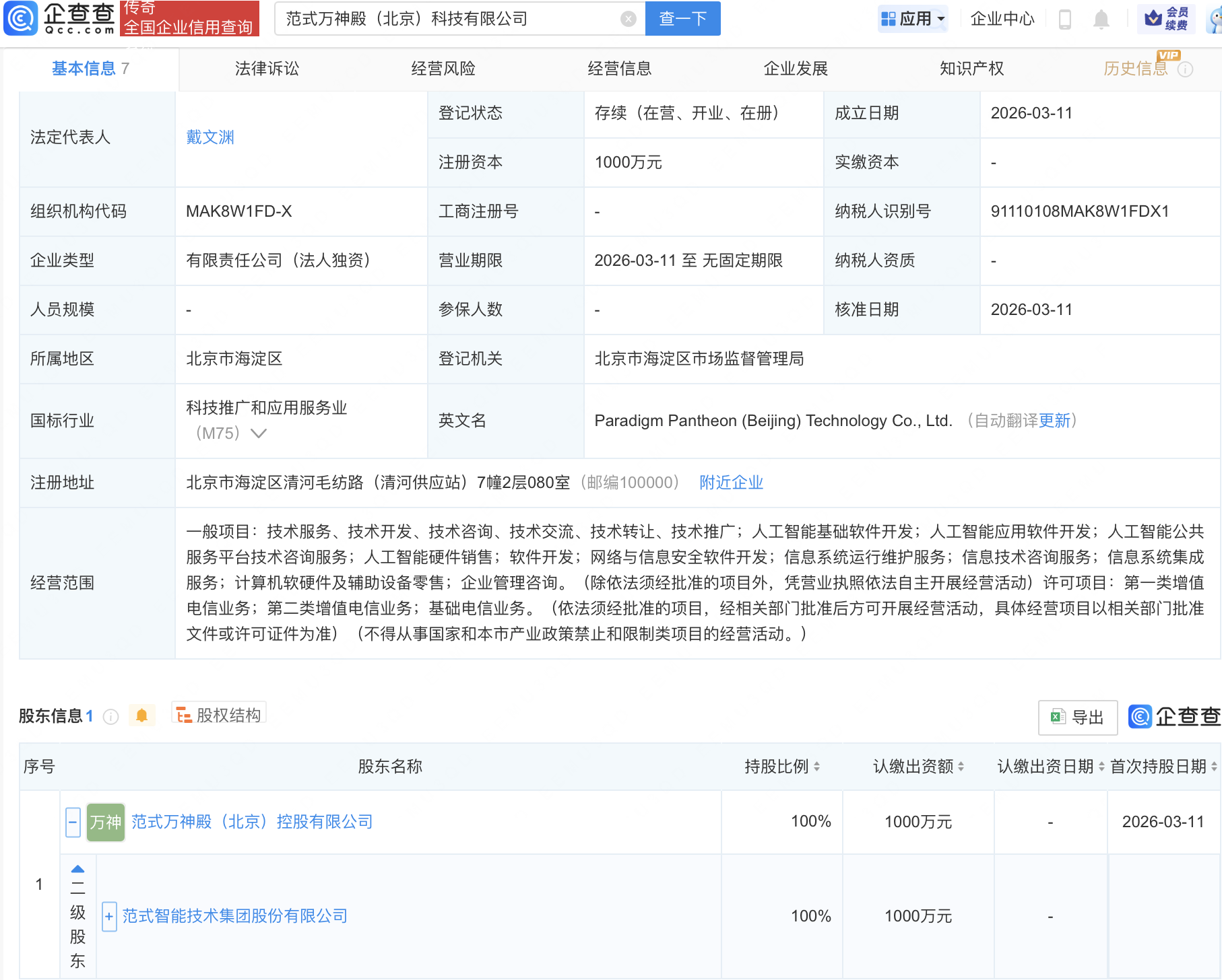 企查查APP显示,近日,范式万神殿(北京)科技有限公司成立,注册资本1000万元,经营范围包含:人工智能基础软件开发;人工智能应用软件开发;人工智能公共服务平台技术咨询服务;人工智能硬件销售等。企查查股权穿透显示,该公司由范式智能(06682.HK)间接全资持股。