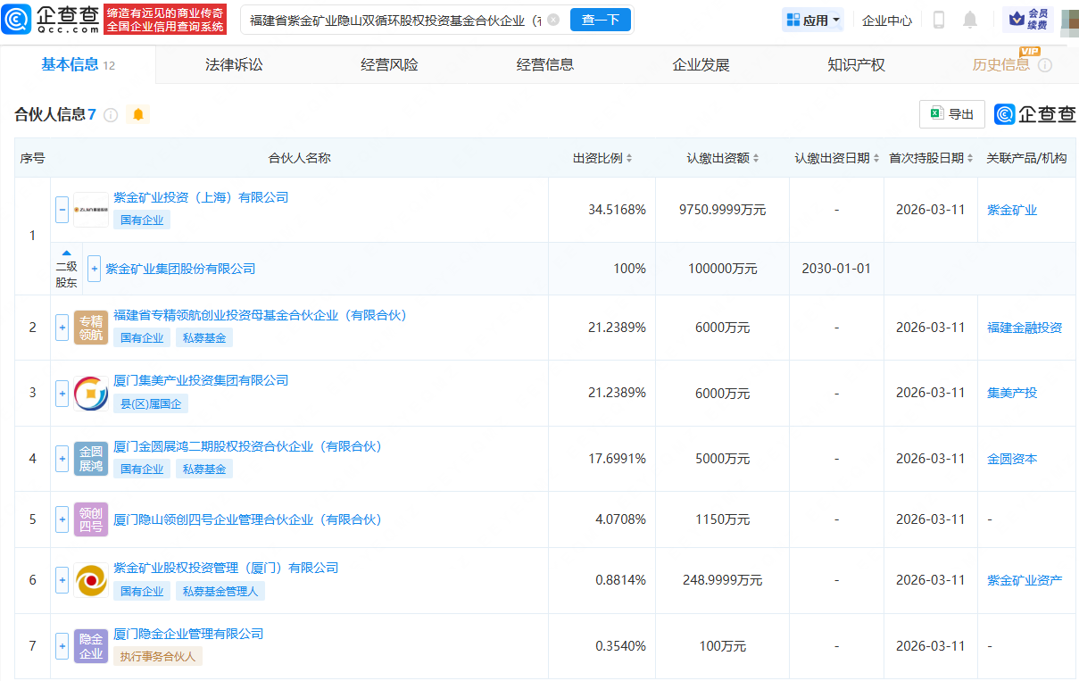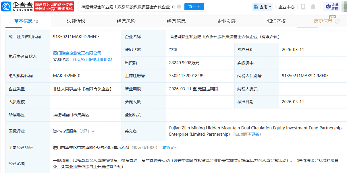 企查查APP显示,近日,福建省紫金矿业隐山双循环股权投资基金合伙企业(有限合伙)成立,出资额2.82亿元,经营范围包含:以私募基金从事股权投资、投资管理、资产管理等活动等。企查查股权穿透显示,该公司由紫金矿业(601899)全资子公司紫金矿业投资(上海)有限公司、厦门集美产业投资集团有限公司等共同持股。