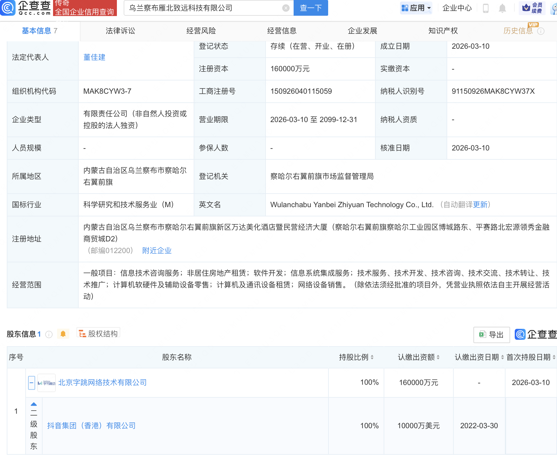 企查查APP显示,近日,乌兰察布雁北致远科技有限公司成立,注册资本16亿元,经营范围包含:信息技术咨询服务;非居住房地产租赁;软件开发;信息系统集成服务等。企查查股权穿透显示,该公司由抖音集团(香港)有限公司间接全资持股。