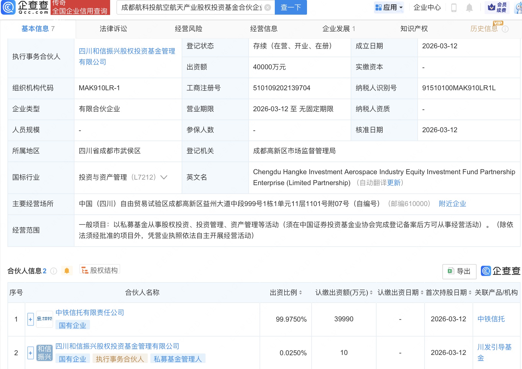 企查查APP显示,近日,成都航科投航空航天产业股权投资基金合伙企业(有限合伙)成立,出资额4亿元,经营范围为以私募基金从事股权投资、投资管理、资产管理等活动。企查查股权穿透显示,该企业由中铁信托有限责任公司、四川和信振兴股权投资基金管理有限公司共同出资。