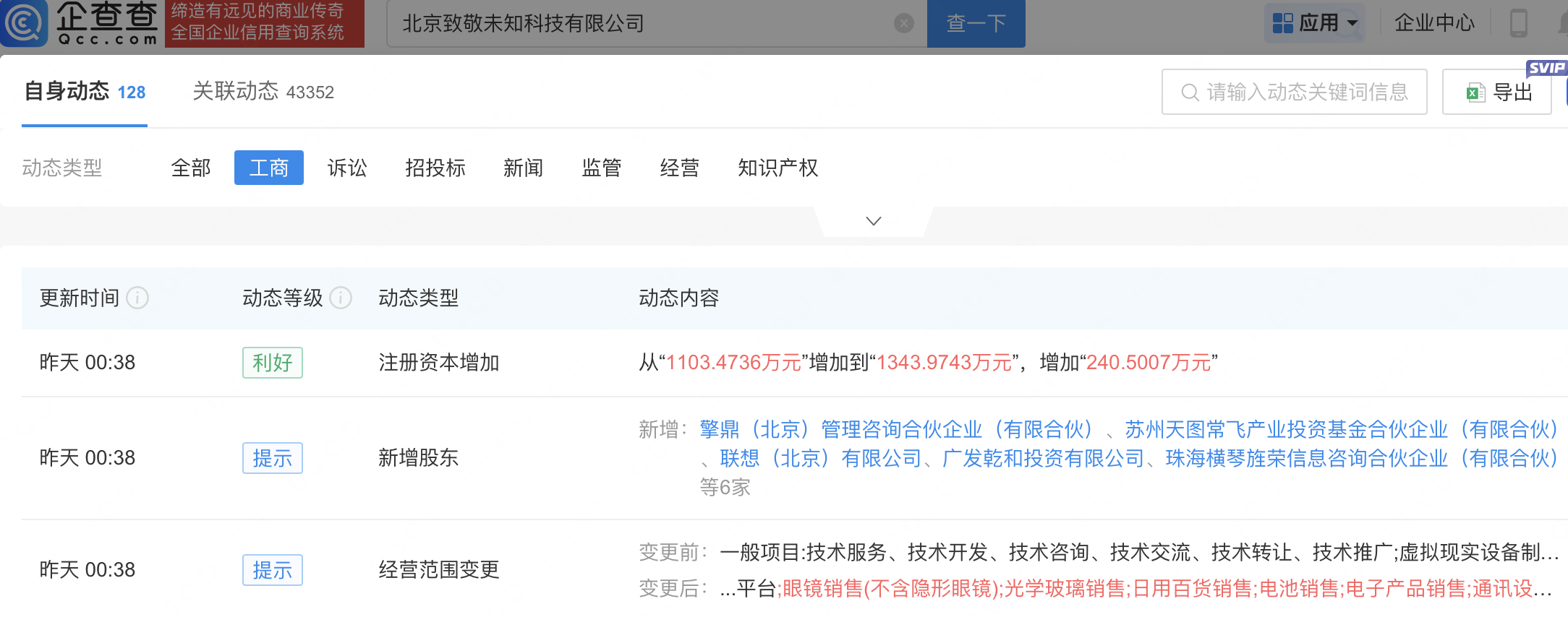 企查查APP显示,近日,北京致敬未知科技有限公司发生工商变更,新增联想(北京)有限公司等为股东,同时注册资本增至1343.97万元。企查查信息显示,该公司成立于2022年,经营范围包含:虚拟现实设备制造;智能机器人的研发;可穿戴智能设备制造;人工智能公共数据平台等。据其官网,该公司将AR全方位融入现实生活,致力打造可穿戴出门,能日常使用的消费级AR眼镜。