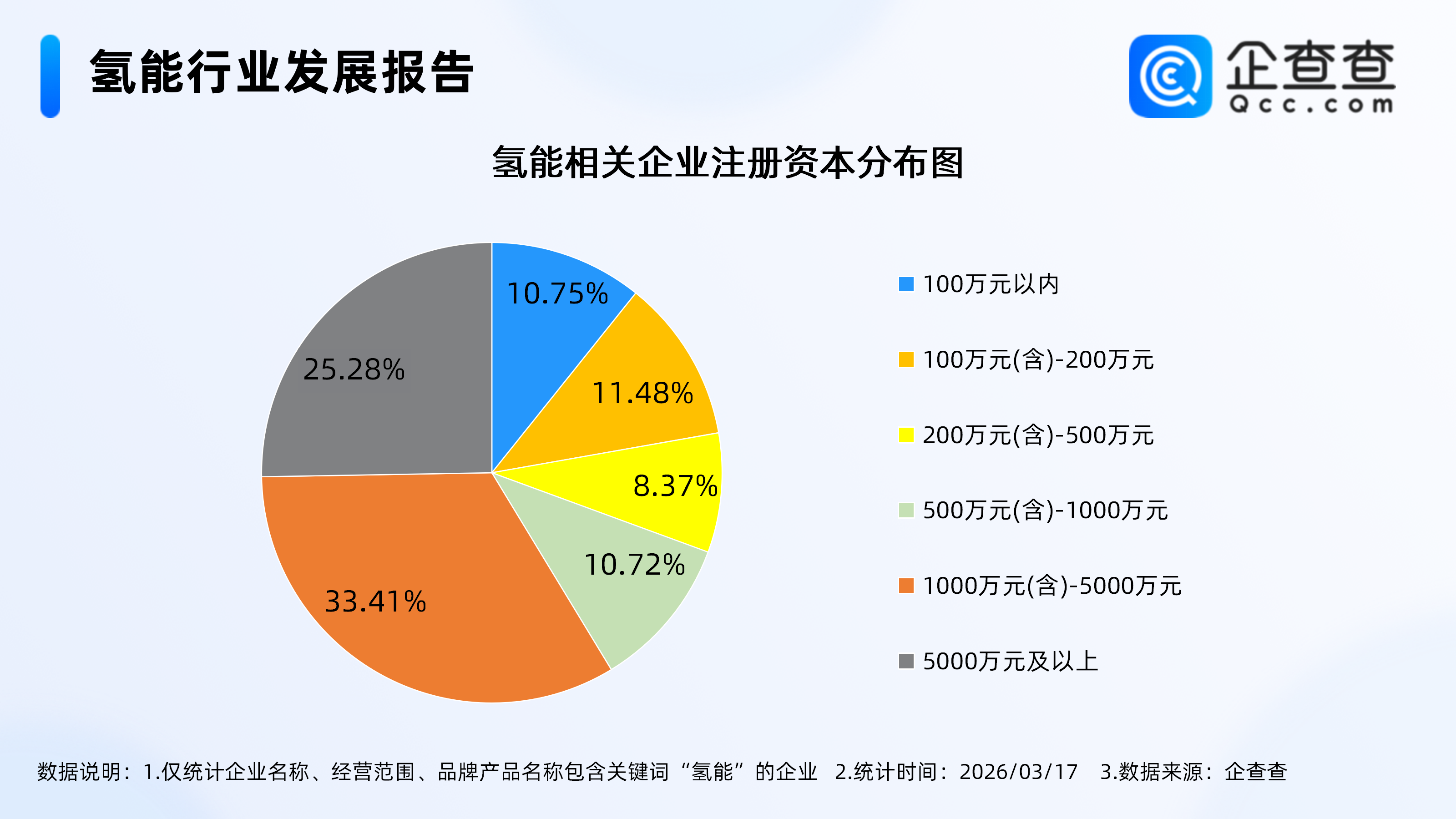 企查查数据显示,氢能相关企业多为资金密集型企业,注册资本在1000万元(含)-5000万元的氢能相关企业占比最高,达33.41%。注册资本5000万元及以上的企业占比25.28%。两者合计占比58.68%,说明超半数氢能企业拥有中大型资本规模,为技术研发、产能建设提供了资金保障。