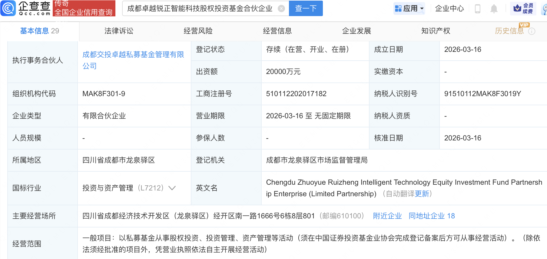 企查查APP显示,近日,成都卓越锐正智能科技股权投资基金合伙企业(有限合伙)成立,经营范围包含:以私募基金从事股权投资、投资管理、资产管理等活动。企查查股权穿透显示,该企业由广安爱众(600979)、复星国际有限公司全资子公司上海复星高科技(集团)有限公司等共同出资。