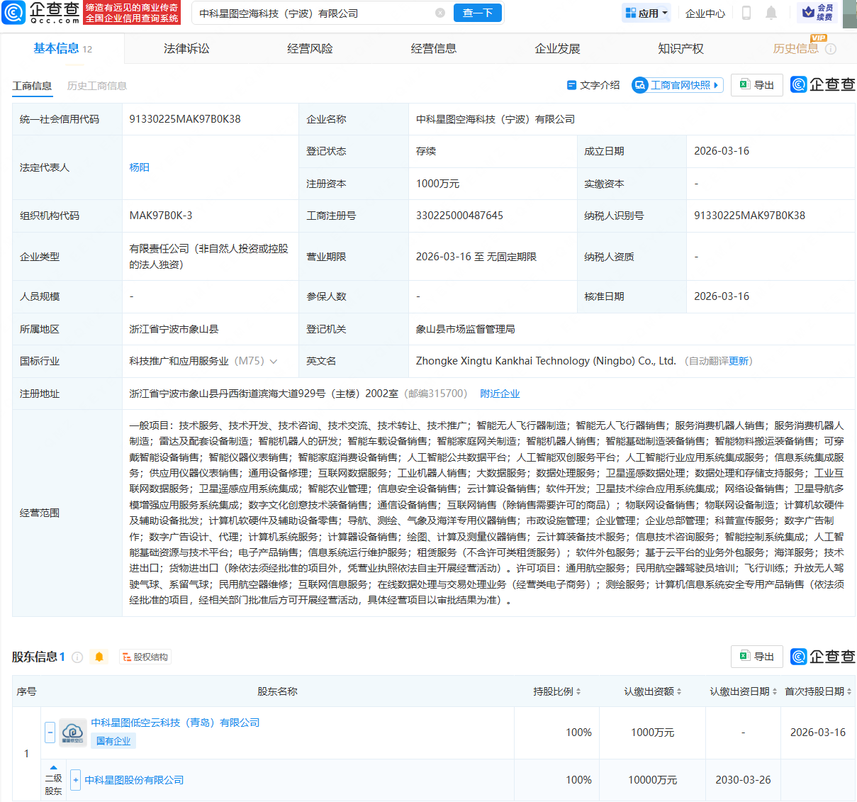 企查查APP显示,近日,中科星图空海科技(宁波)有限公司成立,法定代表人为杨阳,注册资本为1000万元,经营范围包含:智能无人飞行器制造;服务消费机器人销售;服务消费机器人制造;雷达及配套设备制造;民用航空器维修等。企查查股权穿透显示,该公司由中科星图(688568)间接全资持股。