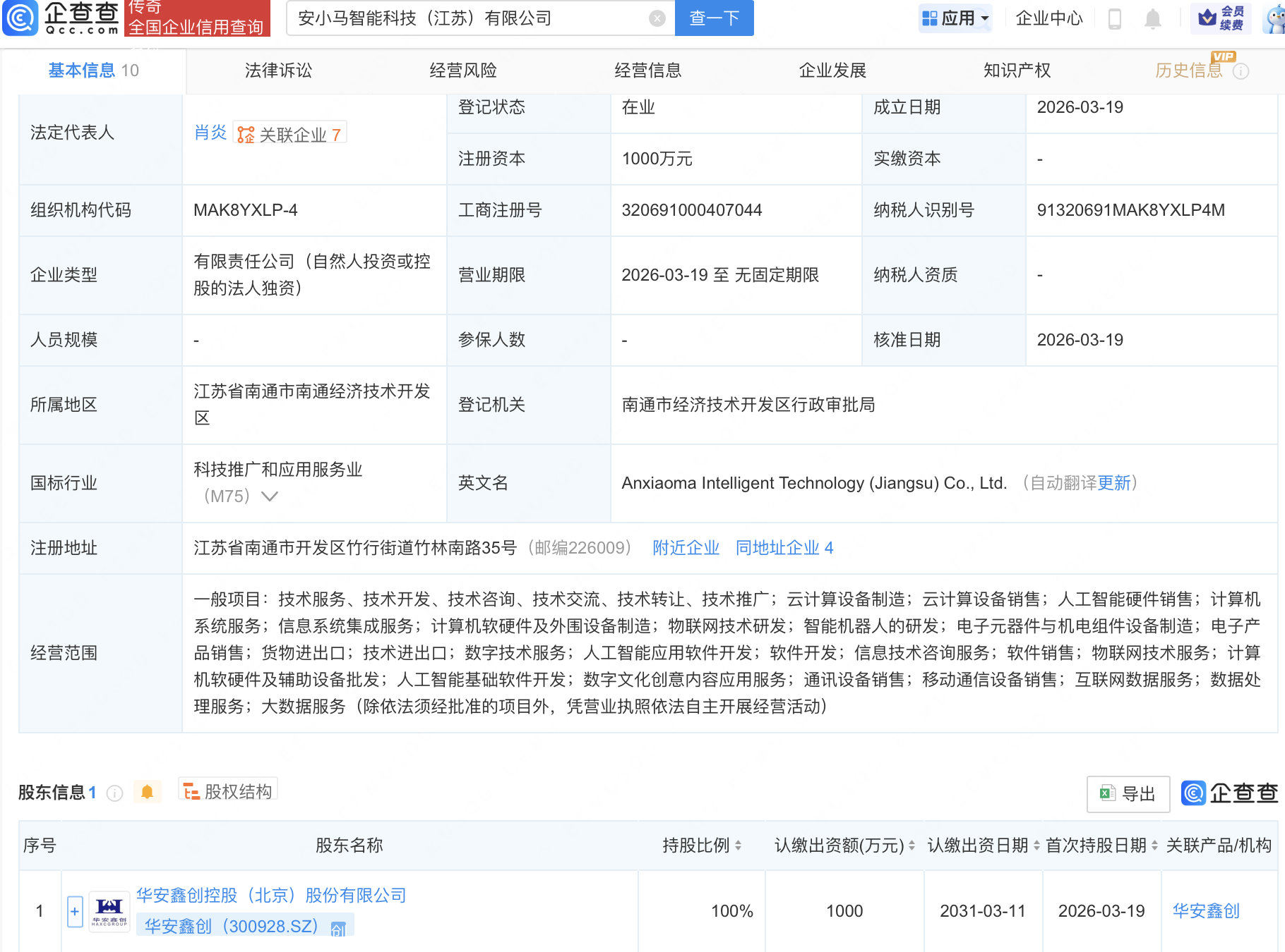 企查查APP显示,近日,安小马智能科技(江苏)有限公司成立,注册资本1000万元,经营范围包含:物联网技术研发;智能机器人的研发;人工智能应用软件开发;软件开发等。企查查股权穿透显示,该公司由华安鑫创(300928)全资持股。