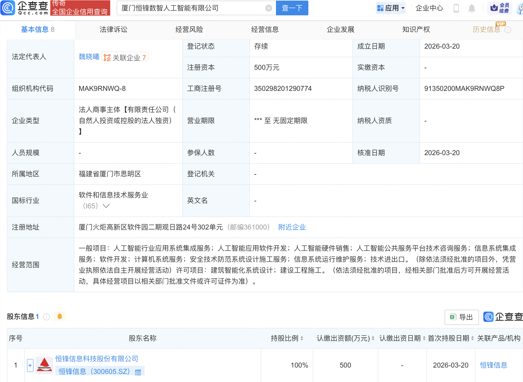 企查查APP显示,近日,厦门恒锋数智人工智能有限公司成立,经营范围包含:人工智能行业应用系统集成服务;人工智能应用软件开发;人工智能硬件销售;人工智能公共服务平台技术咨询服务等。企查查股权穿透显示,该公司由恒锋信息(300605)全资持股。