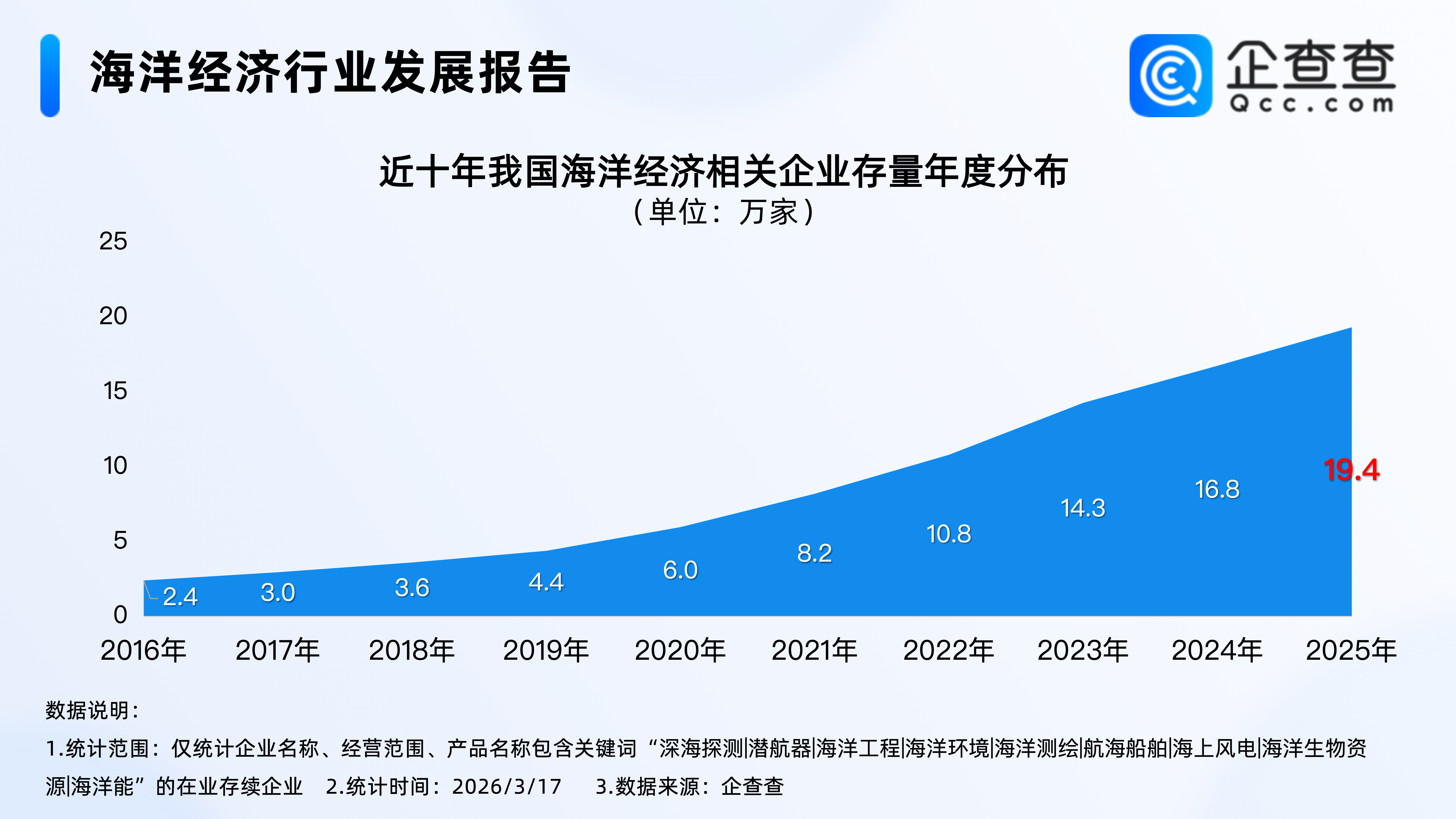 企查查数据显示,近十年,我国海洋经济相关企业存量逐年增加,2025年年底,我国在业存续19.4万家海洋经济相关企业。截至2026年3月17日,我国现存19.7万家海洋经济相关企业。
