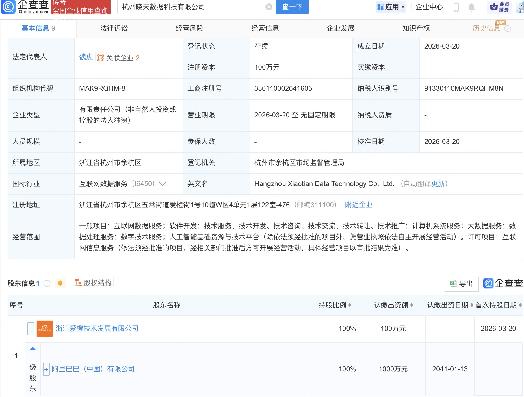 企查查APP显示,近日,杭州晓天数据科技有限公司、杭州衡宇数据科技有限公司成立,法定代表人均为魏虎,经营范围均包括互联网数据服务、软件开发、大数据服务、数据处理服务、人工智能基础资源与技术平台等。企查查股权穿透显示,二者皆由阿里巴巴(中国)有限公司旗下浙江爱橙技术发展有限公司全资持股。