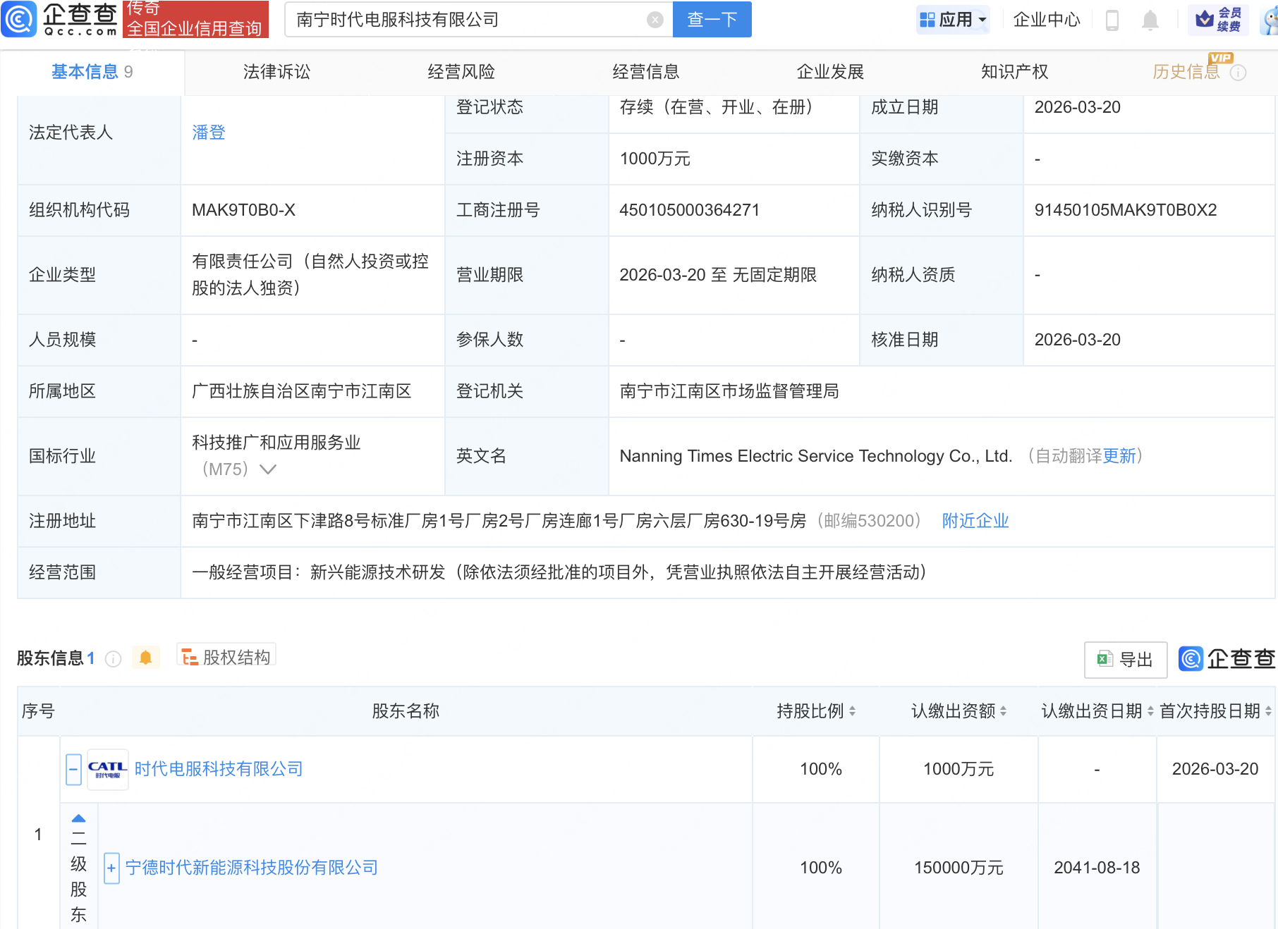企查查APP显示,近日,南宁时代电服科技有限公司成立,注册资本1000万元,经营范围包含新兴能源技术研发。企查查股权穿透显示,该公司由宁德时代(300750)间接全资持股。
