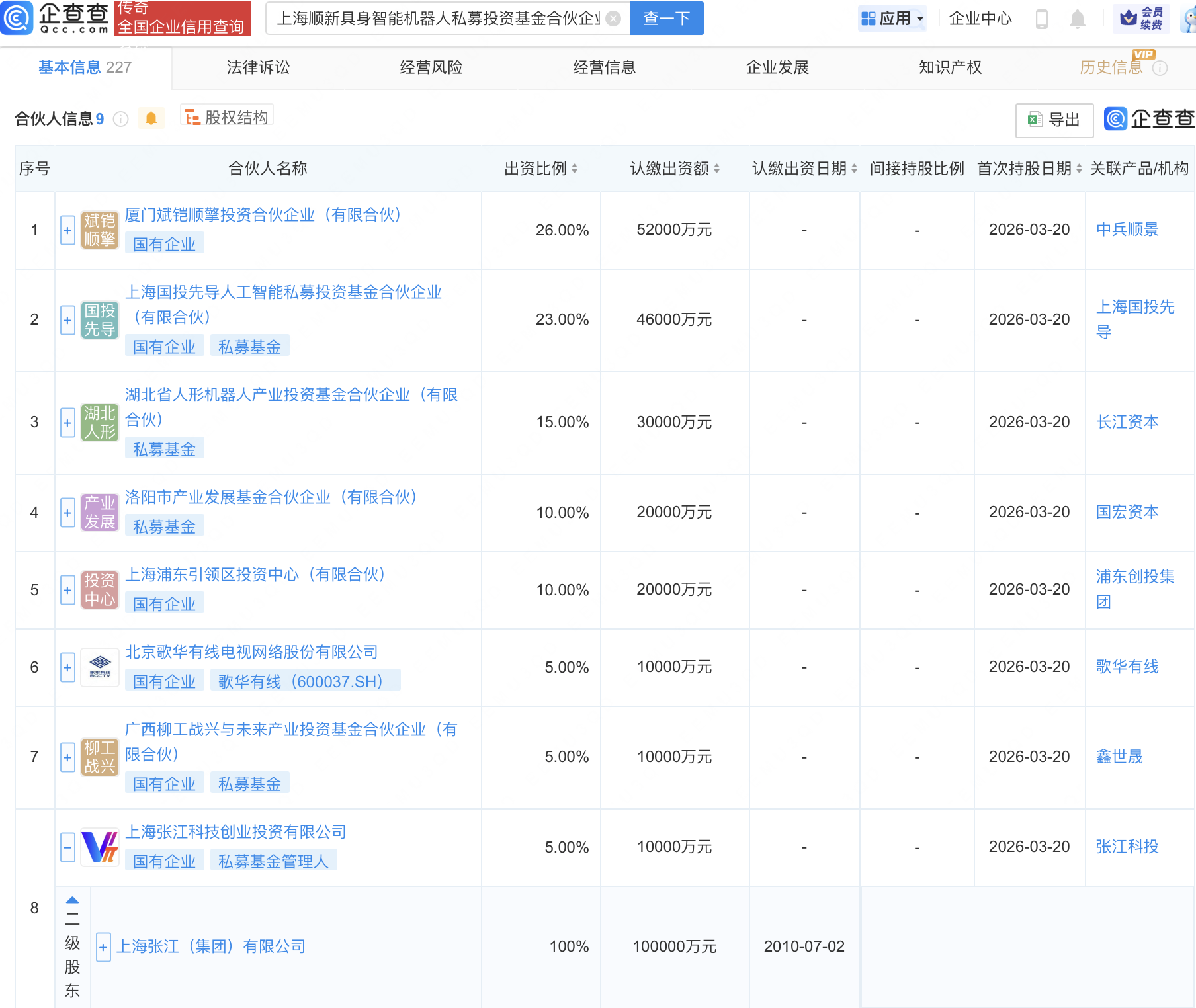 企查查APP显示,近日,上海顺新具身智能机器人私募投资基金合伙企业(有限合伙)成立,出资额20亿元,经营范围包含:以私募基金从事股权投资、投资管理、资产管理等活动。企查查股权穿透显示,该企业由歌华有线(600037)、上海张江(集团)有限公司全资子公司上海张江科技创业投资有限公司等共同出资。