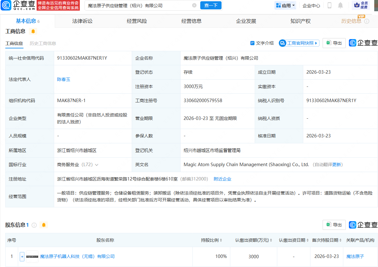 企查查APP显示,近日,魔法原子供应链管理(绍兴)有限公司成立,法定代表人为陈春玉,注册资本为3000万元,经营范围包含:供应链管理服务;仓储设备租赁服务;装卸搬运;道路货物运输(不含危险货物)。企查查股权穿透显示,该公司由魔法原子机器人科技(无锡)有限公司全资持股。