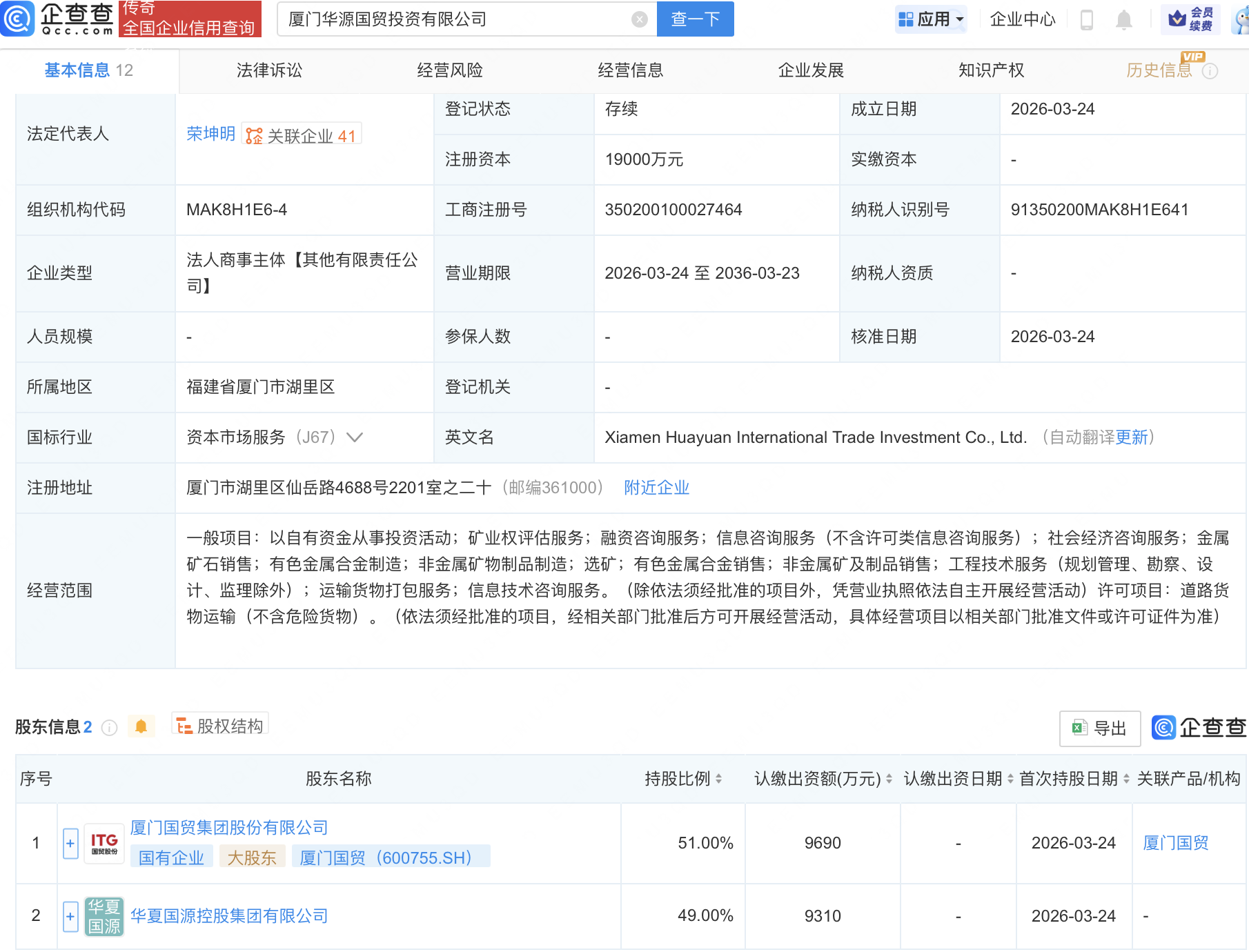 企查查APP显示,近日,厦门华源国贸投资有限公司成立,注册资本1.9亿元,经营范围包含:以自有资金从事投资活动;矿业权评估服务;金属矿石销售;有色金属合金制造;非金属矿物制品制造等。企查查股权穿透显示,该公司由厦门国贸(600755)等共同持股。